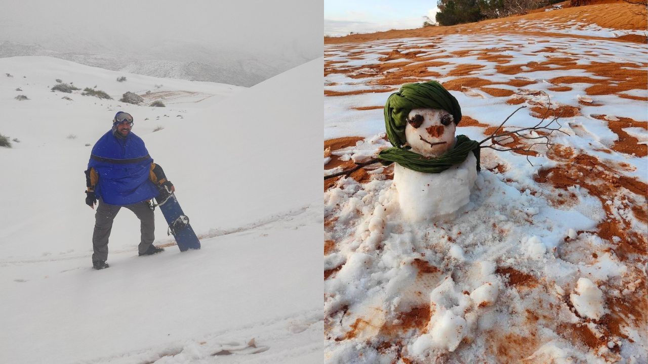 A paisagem costuma ser dominada por tons quentes de areia e pedra, mas, naquele dia, o cenário parecia outro. Segundo Bouchetata, o contraste entre o amarelo das dunas e o branco da neve foi justamente o que chamou sua atenção ao fotografar.