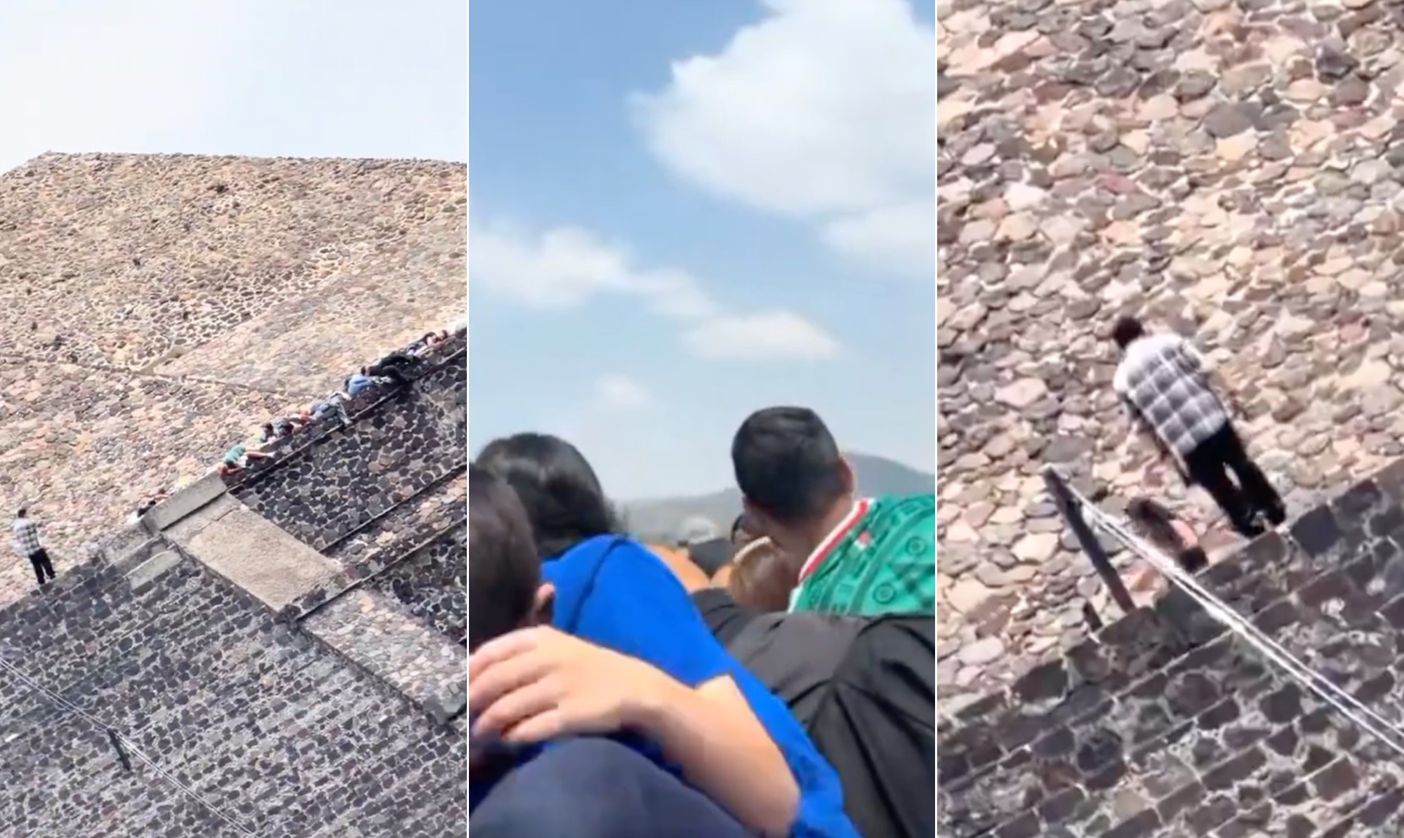 Outros vídeos compartilhados nas redes sociais mostram registros de longe do momento do ataque. Nas imagens é possível ver várias pessoas agachadas num ponto da pirâmide enquanto um homem armado vestido de camisa xadrez e máscara no rosto anda de um lado para o outro.