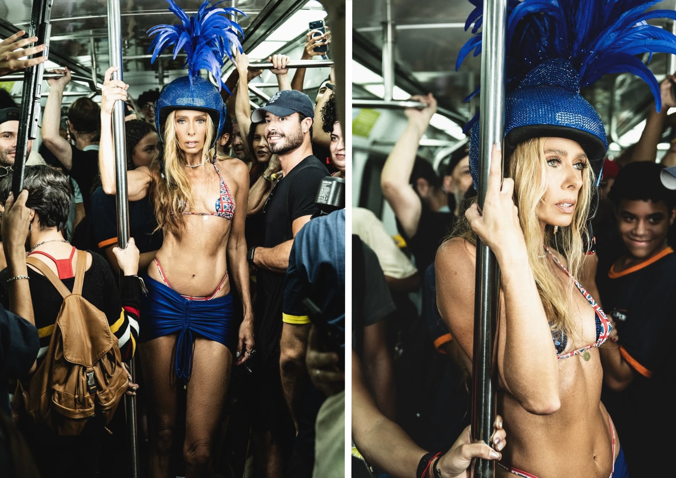 Nas fotos, Adriane surge de biquíni e sainha, fazendo poses, caras e bocas dentro de um vagão cheio, enquanto é observada por populares. Ela embarcou na estação General Osório, em Ipanema, na Zona do Sul.
