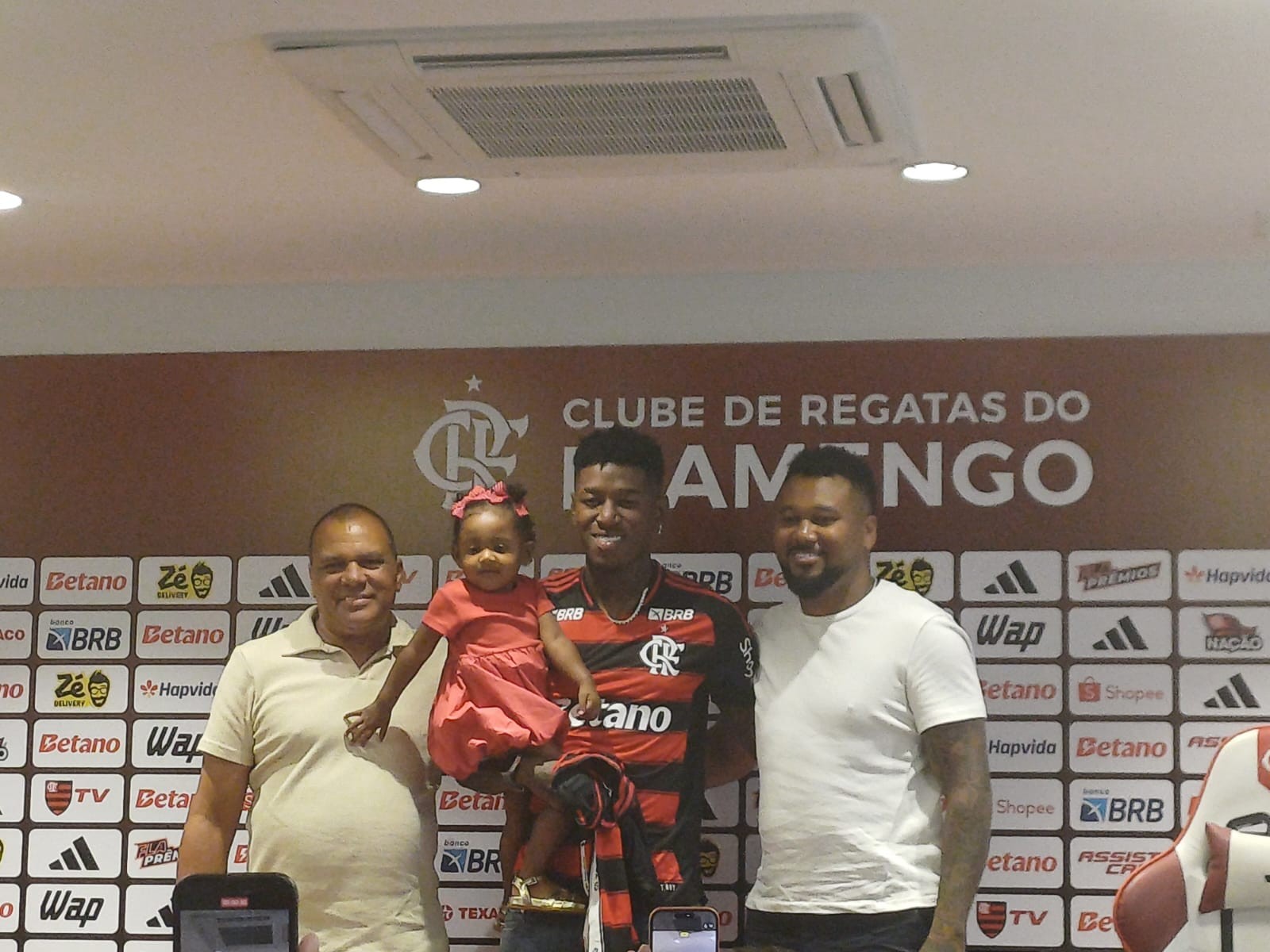 Vitão, que utilizará a camisa 44, também valorizou a família, presente na apresentação. Eles chegaram a posar para fotos com o zagueiro: