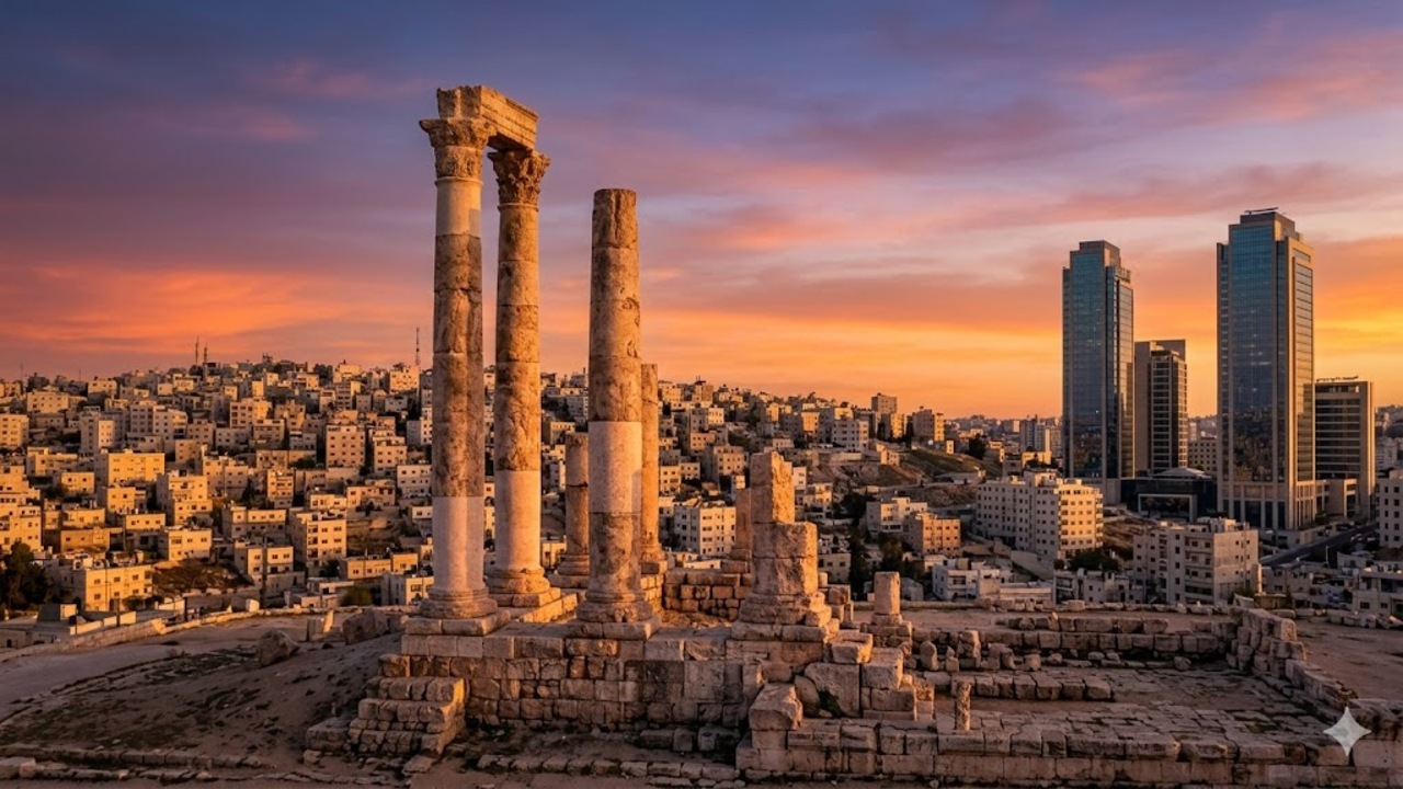Arquitetura urbana em cidade da Jordânia com integração de ruínas romanas une o passado clássico ao futuro moderno