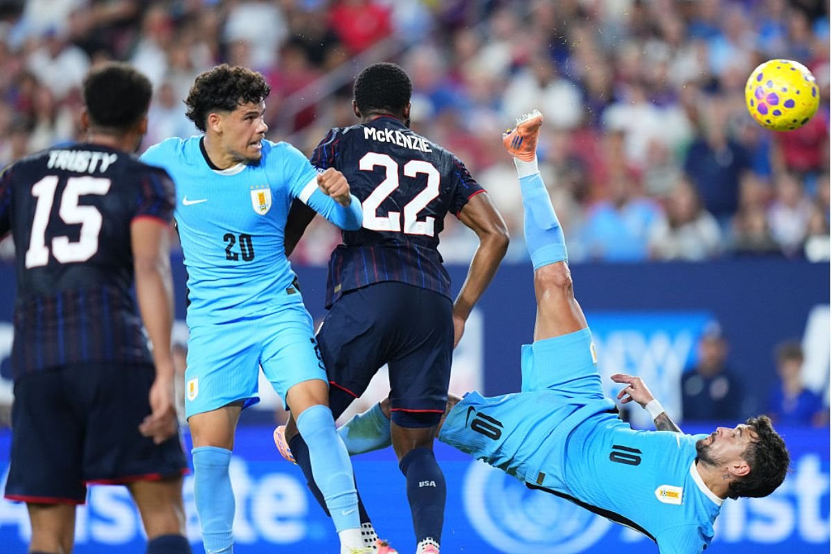 Meia uruguaio marcou um lindo gol de bicicleta nos acréscimos do primeiro tempo, salvando o Uruguai de ir para o intervalo em branco