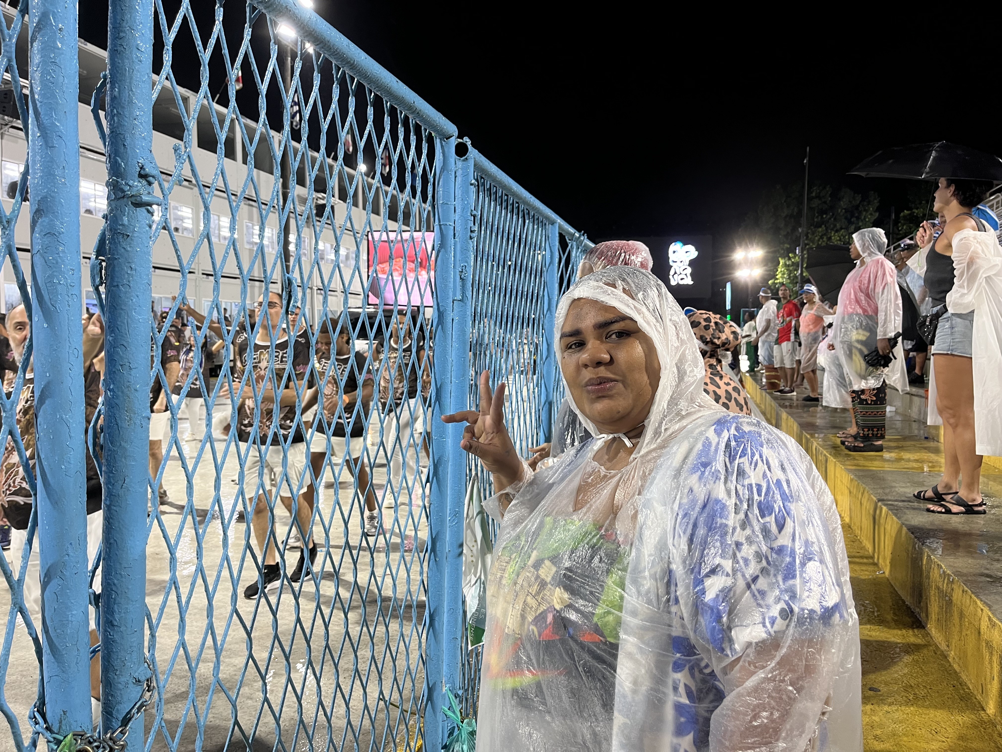 Na arquibancada, a empolgação da comunidade se manteve até o fim, apesar da chuva. A dona de casa Daiane Marcelle chegou à Sapucaí por volta das 20h, direto do trabalho, e aproveitou o ensaio técnico após não conseguir ingresso para o desfile oficial.
