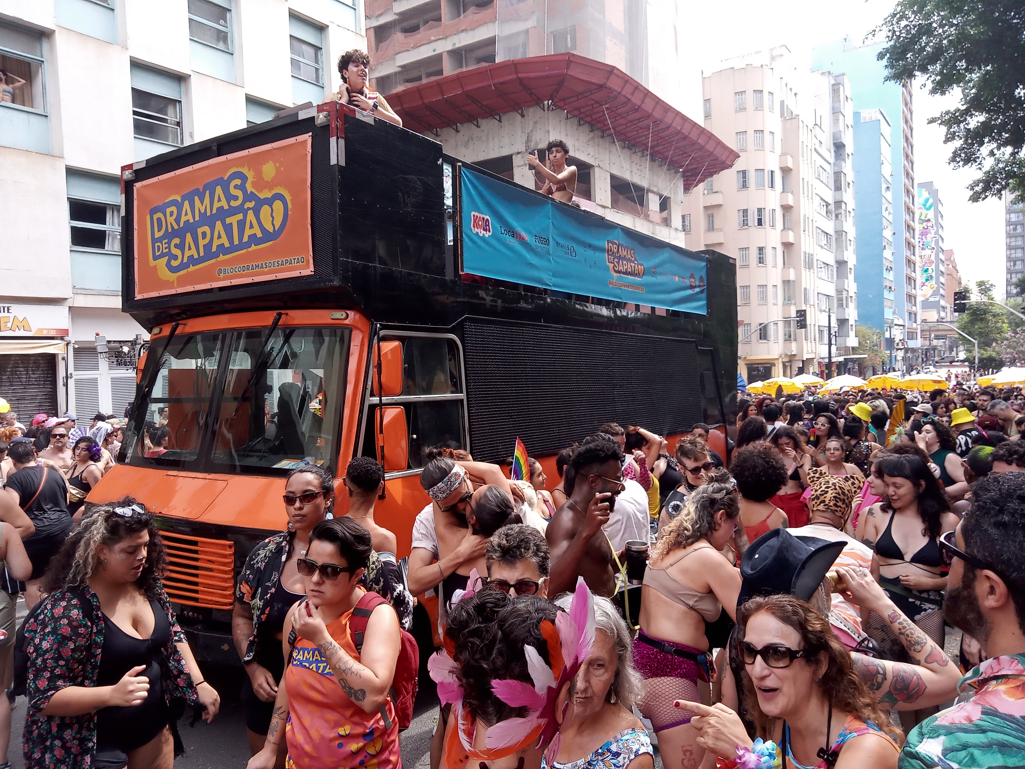 Com som no talo durante toda a apresentação, o trio das drag queens disputou volume com outro bloco mais modesto, mas não menos animado, que estava a três quarteirões de distância, no largo do Arouche.