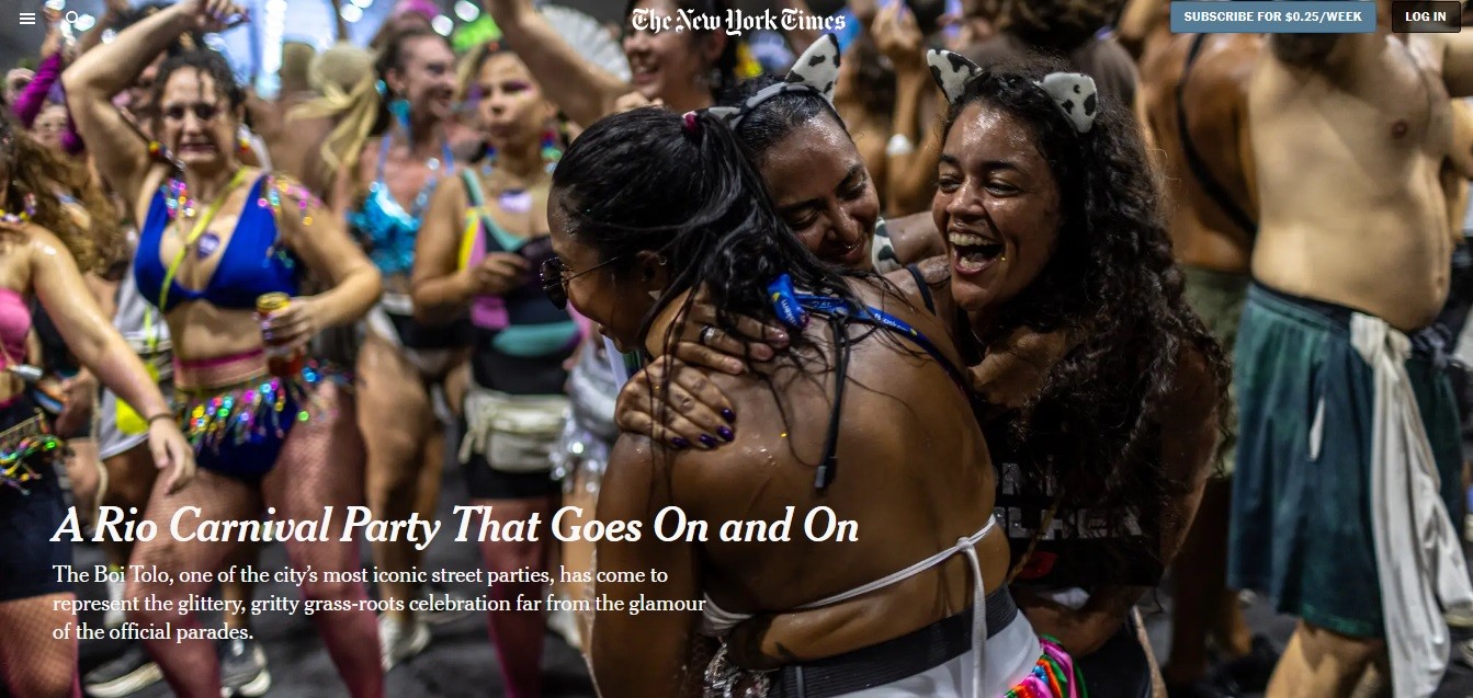 O jornal The New York Times, que percorre o mundo em busca de grandes histórias, dedicou uma de suas reportagens à experiência de acompanhar pelas ruas do Rio de Janeiro o… Boi Tolo, um dos mais conhecidos blocos do carnaval de rua carioca. Matéria exclusiva para assinantes. Para ter acesso completo, acesse o link da matéria e faça o seu cadastro.