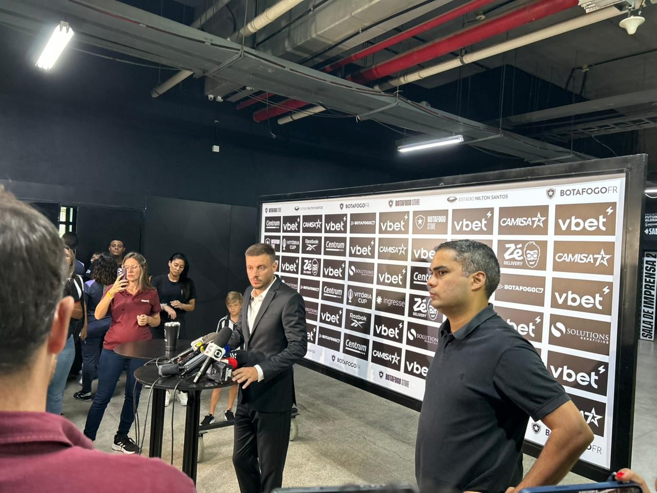 Segundo o Botafogo, a queda de luz foi decorrente de um problema no transformador externo. A solução encontrada foi retirar todos da sala de entrevistas e levá-los para a zona mista do Nilton Santos, setor atendido pelo gerador do estádio.