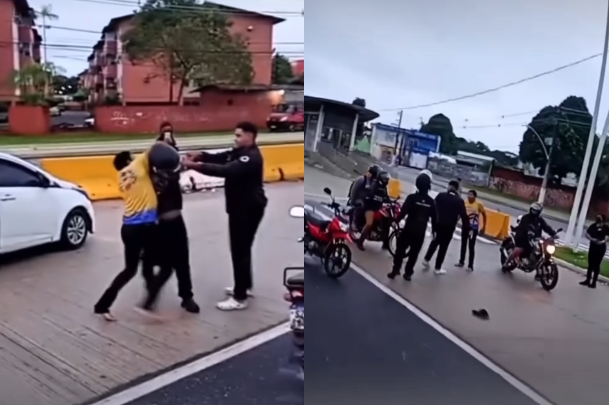 Segundo o relato de quem gravava a cena, a confusão teria começado após um dos envolvidos alegar que não pagaria os prejuízos causados à motocicleta após a batida, o que evoluiu para agressões físicas.