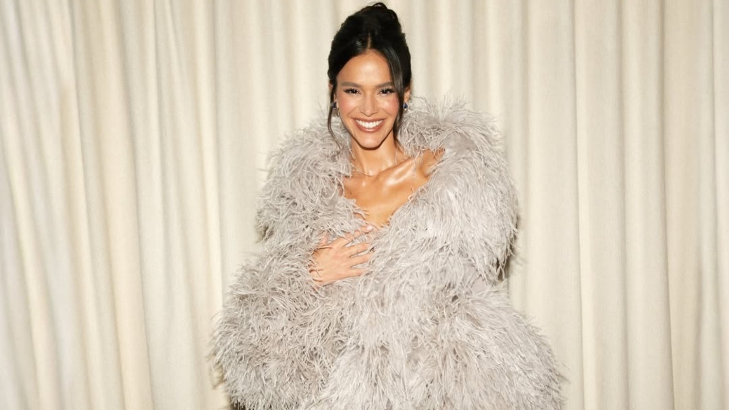 Na construção do styling, Bruna opta pelo contraste inteligente. O scarpin nude alonga a silhueta e deixa o protagonismo com a peça principal, enquanto as joias Ara Vartanian adicionam brilho na medida certa. O coque polido, com franjas soltas, reforça a estética elegante sem competir com o volume do look, uma escolha que evidencia maturidade fashion.
