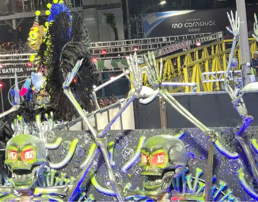 O carro contou ainda com um esqueleto central erguendo uma caixa, instrumento "de guerra" do mestre Ciça, conhecido como sua marca entre os ritmistas do carnaval. Foi ao redor dessa caveira que houve um descuido com o acabamento do carro alegórico: o entorno da estrutura prateada de ossos estava descoberto, com ferros, madeiras, canos, fios e tomadas aparecendo.