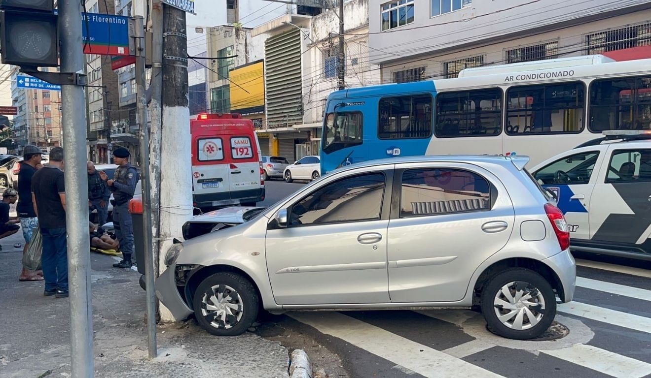 Carro bate em moto, perde controle e atinge poste no Centro de Vitória