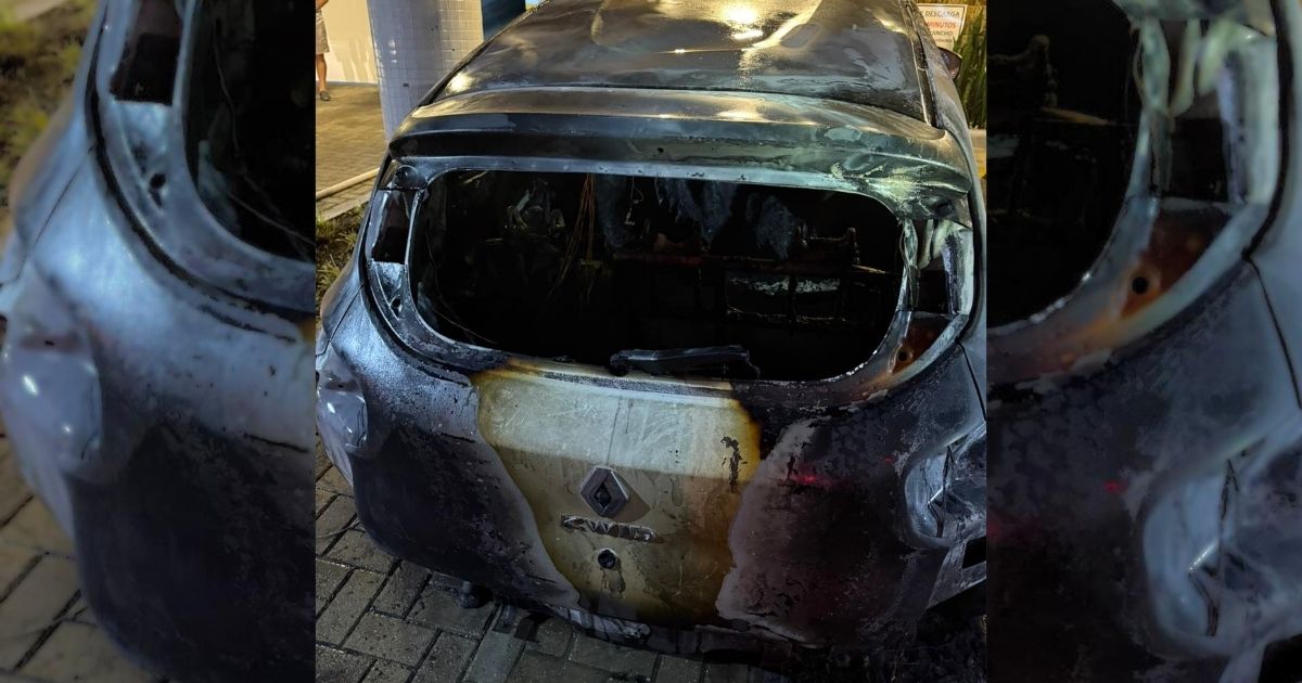Câmeras de segurança registraram uma pessoa de moletom ateando fogo ao veÃculo na madrugada deste sábado (21)