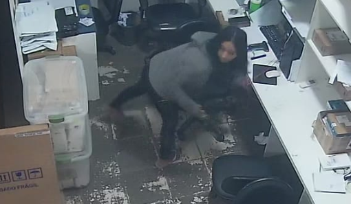 Pelo horário, a loja estava recém aberta. O suspeito parece agitado e,por fim, ele também entra na mesma sala restrita, onde já estavam a suspeita do assalto e a funcionária.