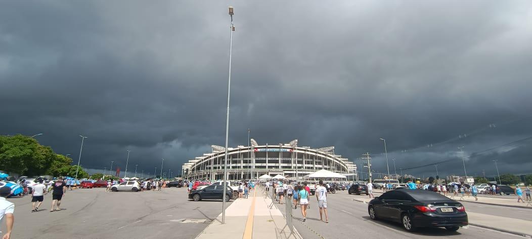 Mas foi o céu carregado que acabou chamando a atenção de quem seguia rumo ao estádio. A tradicional chuva da tarde “armou a tenda” sobre o Mangueirão e rapidamente tomou conta do entorno, acompanhada de forte ventania.