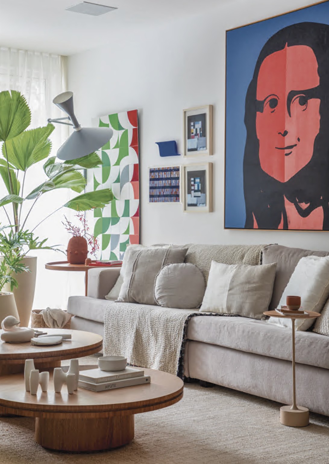 Na sala de jantar, o mural de azulejos entrou no lugar do antigo espelho — assinatura do Coletivo Muda, do qual seu filho Duke Capellão faz parte. “Nosso trabalho é abstrato, mas eu quis que esse painel refletisse, com cores, a alegria dos milhares de almoços de domingo naquela mesa, ao longo das décadas”, lembra Duke, que também é arquiteto e reconhece o presente como um agradecimento ao total incentivo da mãe por sua carreira nas artes: “Sempre foi e continua sendo uma casa de parcerias e cheia de afeto, nunca vazia”.