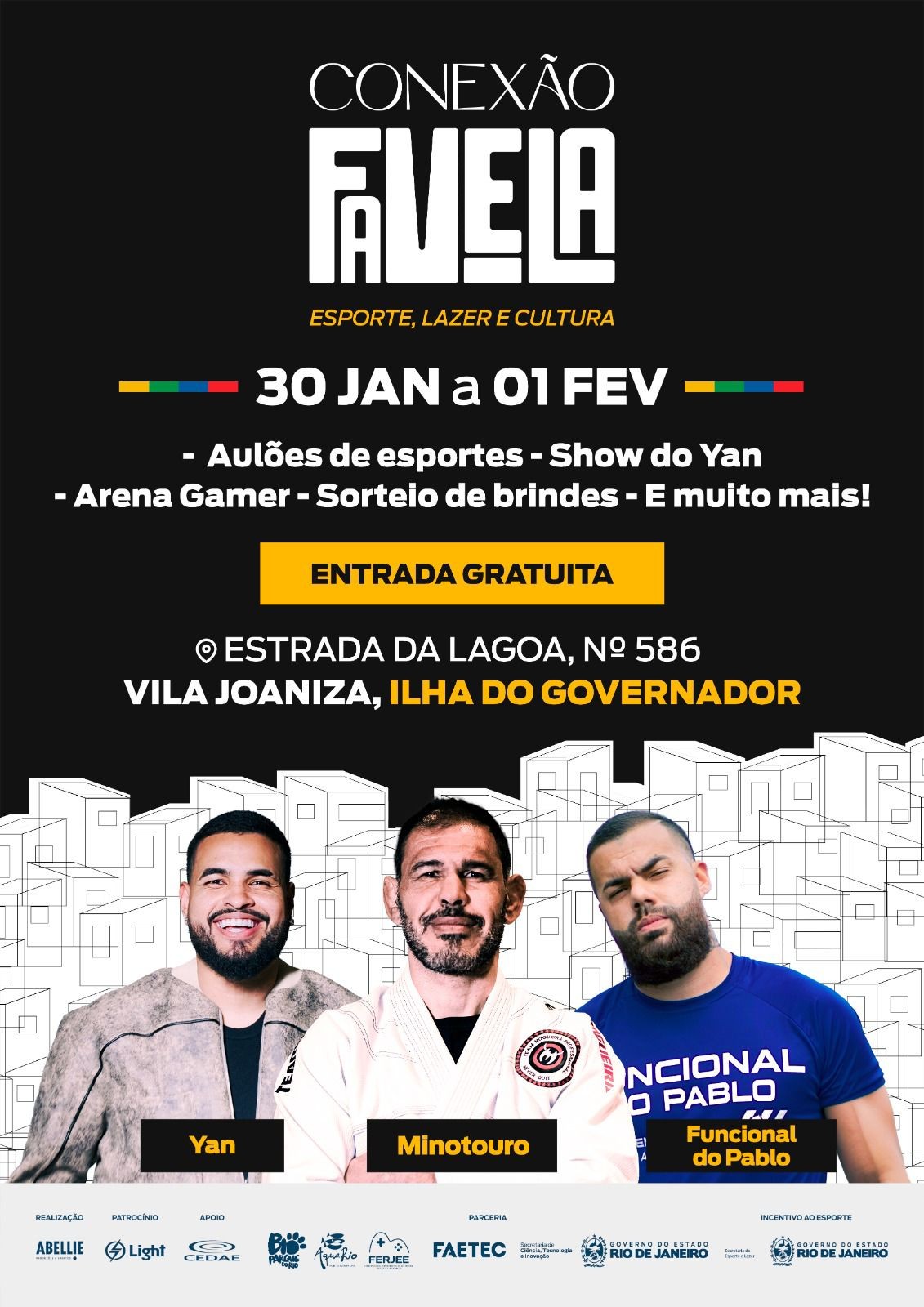 O Conexão Favela é realizado na Estrada da Lagoa, 586, Vila Joaniza, com entrada gratuita, e integra um projeto itinerante que leva esporte e lazer a diferentes regiões do estado do Rio de Janeiro.