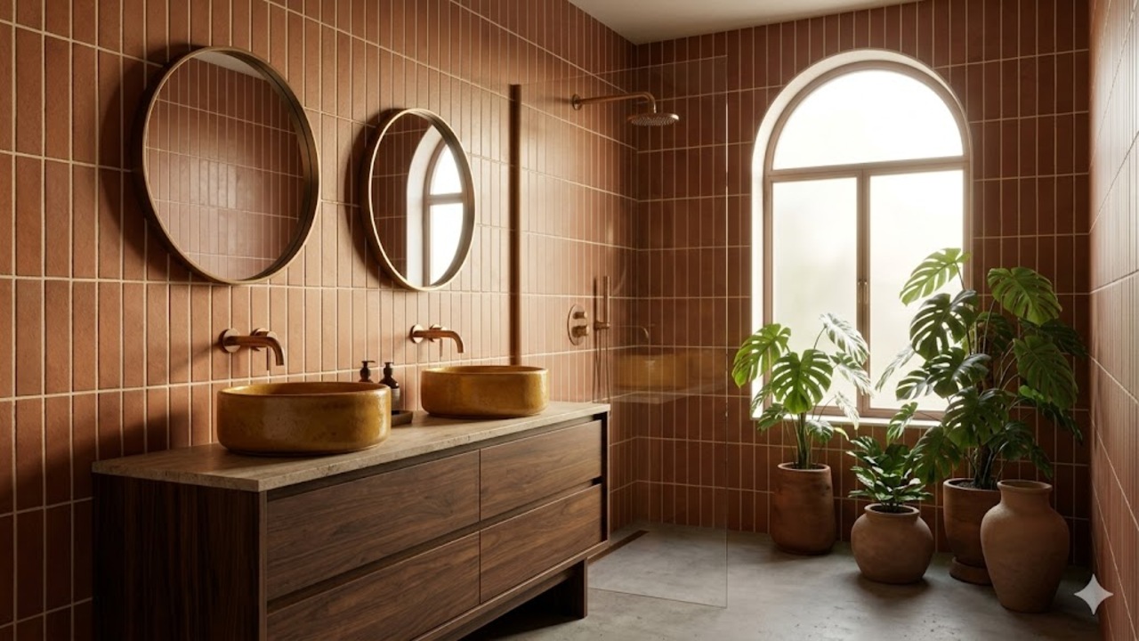Conheça a tendência dos banheiros em tons terrosos que resgata o estilo retrô em 2026