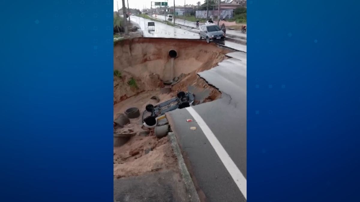 Estrada que liga Fortaleza ao município de Eusébio (CE) cedeu em meio às fortes chuvas que atingem o estado