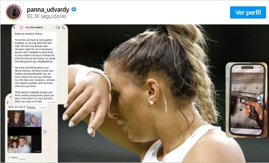 “A pessoa me disse que, se eu não perdesse a partida hoje, ela machucaria membros da minha família. Disse que sabia onde minha família mora, que carros eles dirigem e que tinha os números de telefone deles. Chegou a enviar fotos dos meus familiares e uma foto de uma arma”, escreveu Udvardy no Instagram.
