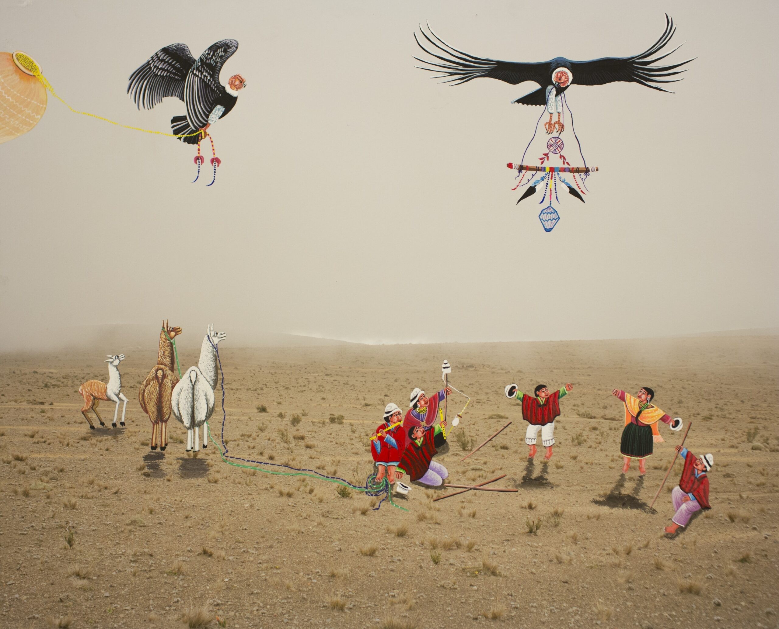 Outro núcleo reúne obras que evocam narrativas religiosas, símbolos populares e universos fabulatórios. Sem recorrer ao exotismo, a curadoria destaca como a imaginação de realidades alternativas assume formas distintas. Bandeiras vodu, esculturas sacras, imagens simbólicas e personagens históricos reinventados apontam para experiências que dialogam entre si, ainda que marcadas por realidades e contextos diversos.