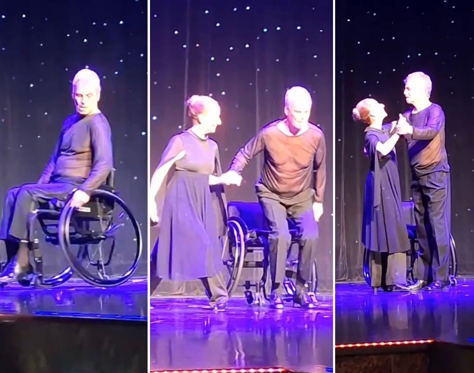 Ao fim da apresentação, ele emocionou a plateia ao se levantar da cadeira e ficar de pé.