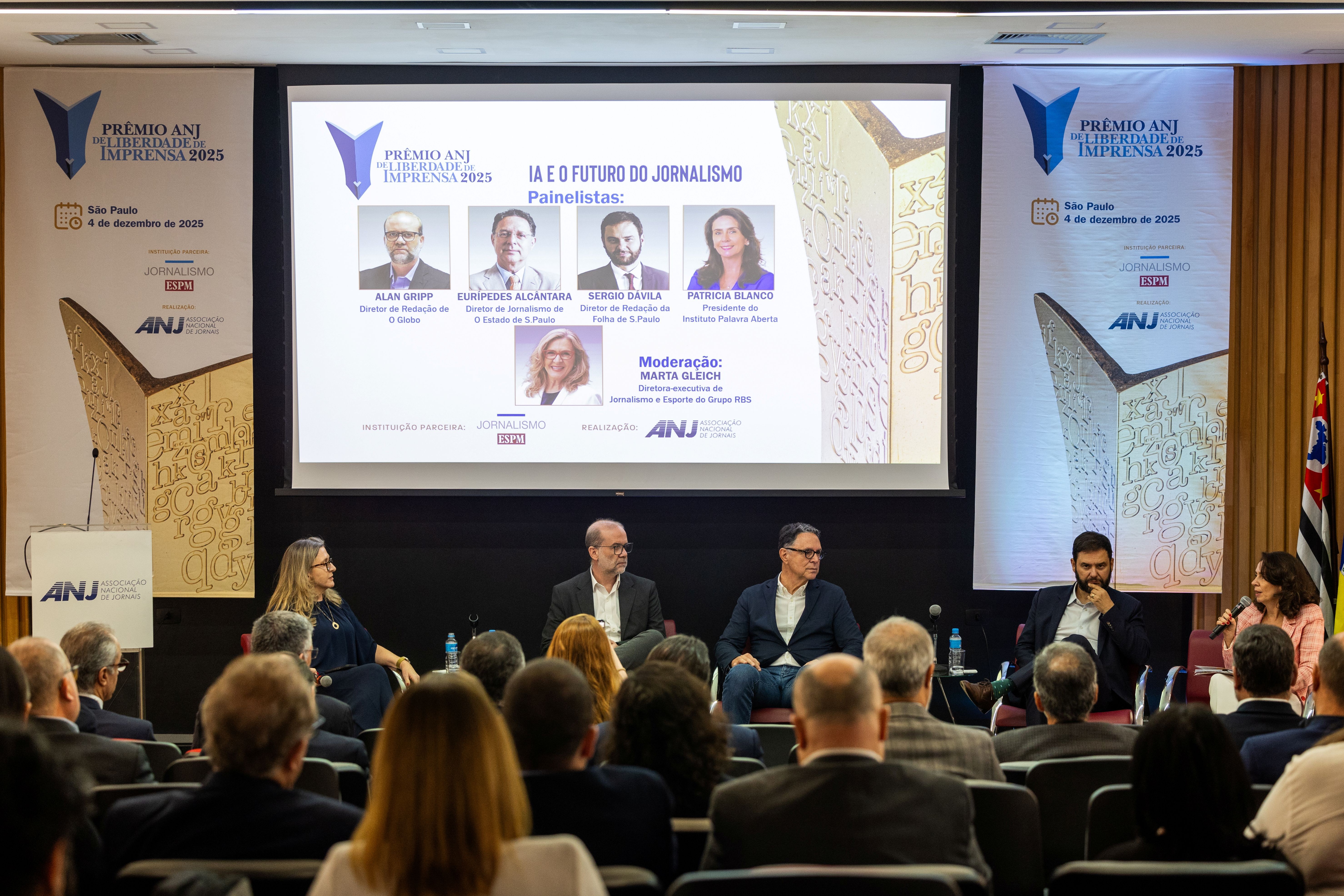 A necessidade de uma imediata regulação do uso do conteúdo jornalístico por parte das ferramentas de Inteligência Artificial esteve no centro do debate “IA e o futuro do jornalismo”, promovido pela Associação Nacional de Jornais (ANJ) na quinta (4). O debate, realizado Escola Superior de Propaganda e Marketing (ESPM), na Vila Mariana, Zona Sul de São Paulo, teve mediação de Marta Gleich, diretora-executiva de jornalismo e esporte do Grupo RBS, e contou com a participação dos diretores de redação Alan Gripp (O GLOBO), Sérgio Dávila (Folha de S.Paulo) e Eurípedes Alcântara (O Estado de S.Paulo), e da presidente do Instituto Palavra Aberta, Patricia Blanco.
