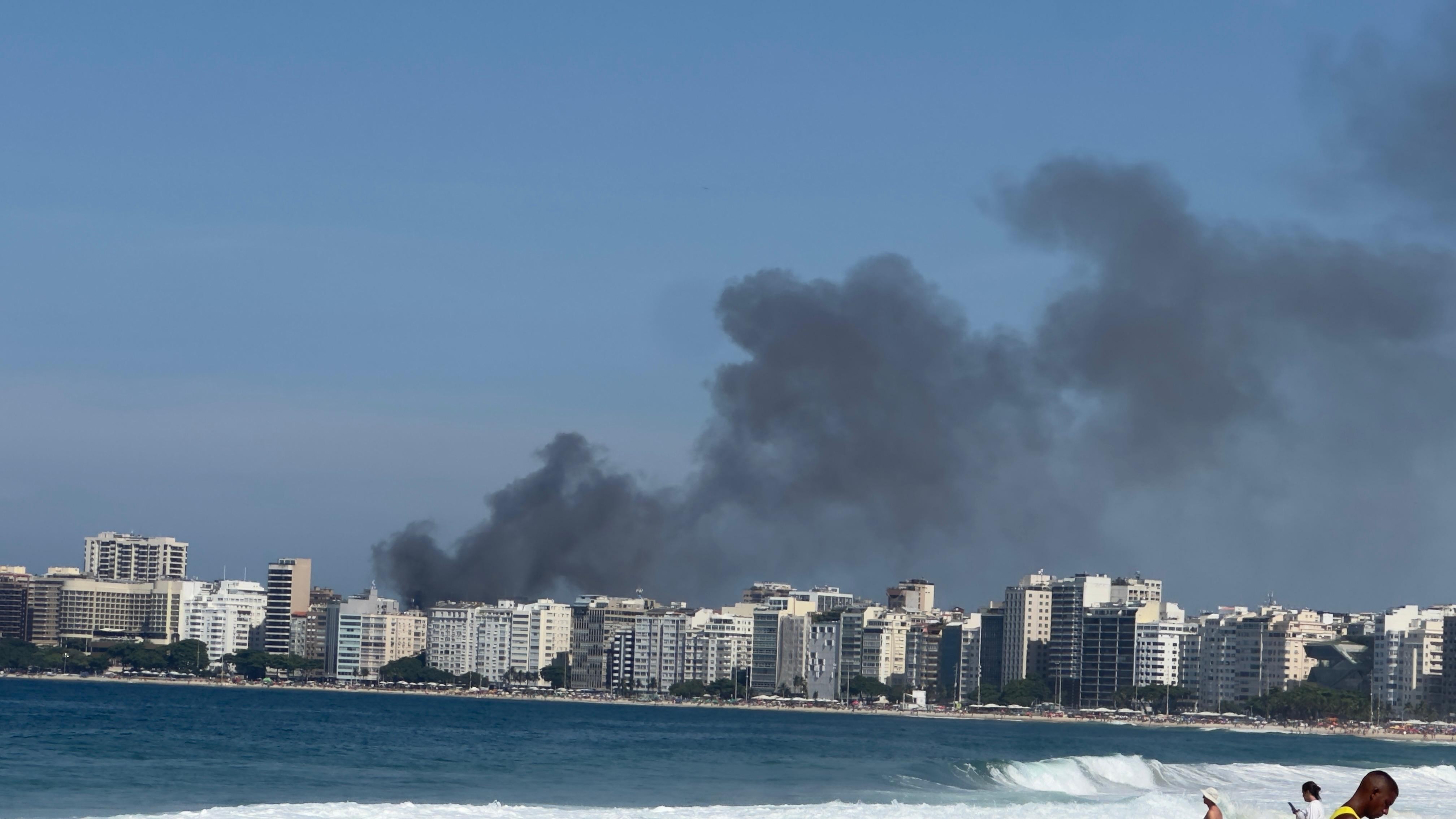 As labaredas do local do incêndio provocaram uma grande coluna de fumaça, que pode ser vista por quem estava na orla.