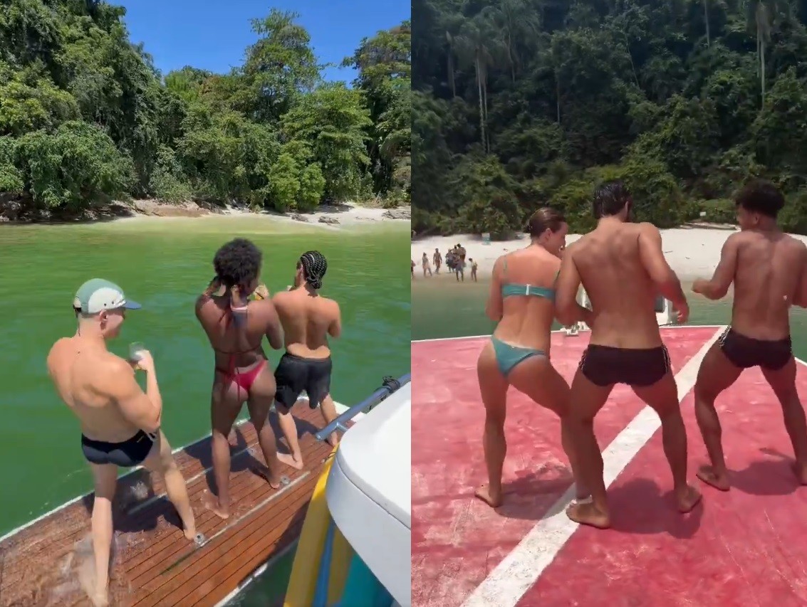 De folga das gravações de "Três Graças", Vinicius Teixeira, Luiza Rosa e Lucas Righi estão aproveitando belas paisagens pelo interior do Rio de Janeiro para descansar. Em determinado momento, em um passeio de barco, o trio da Chacrinha até aproveitou para brincar com os colegas da novela anterior.