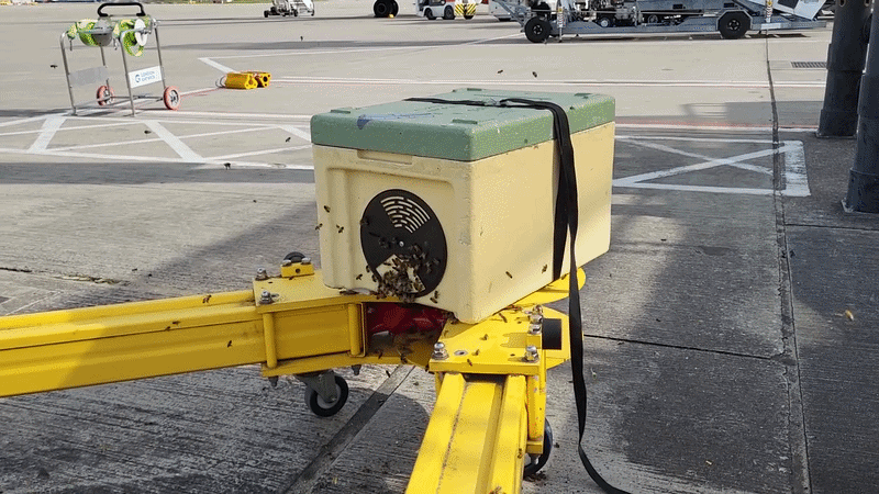 Após passar seus equipamentos pela segurança do aeroporto, o apicultor utilizou uma nuc box — uma espécie de “mini-colmeia” usada para armazenamento e transporte — para recolher as abelhas.