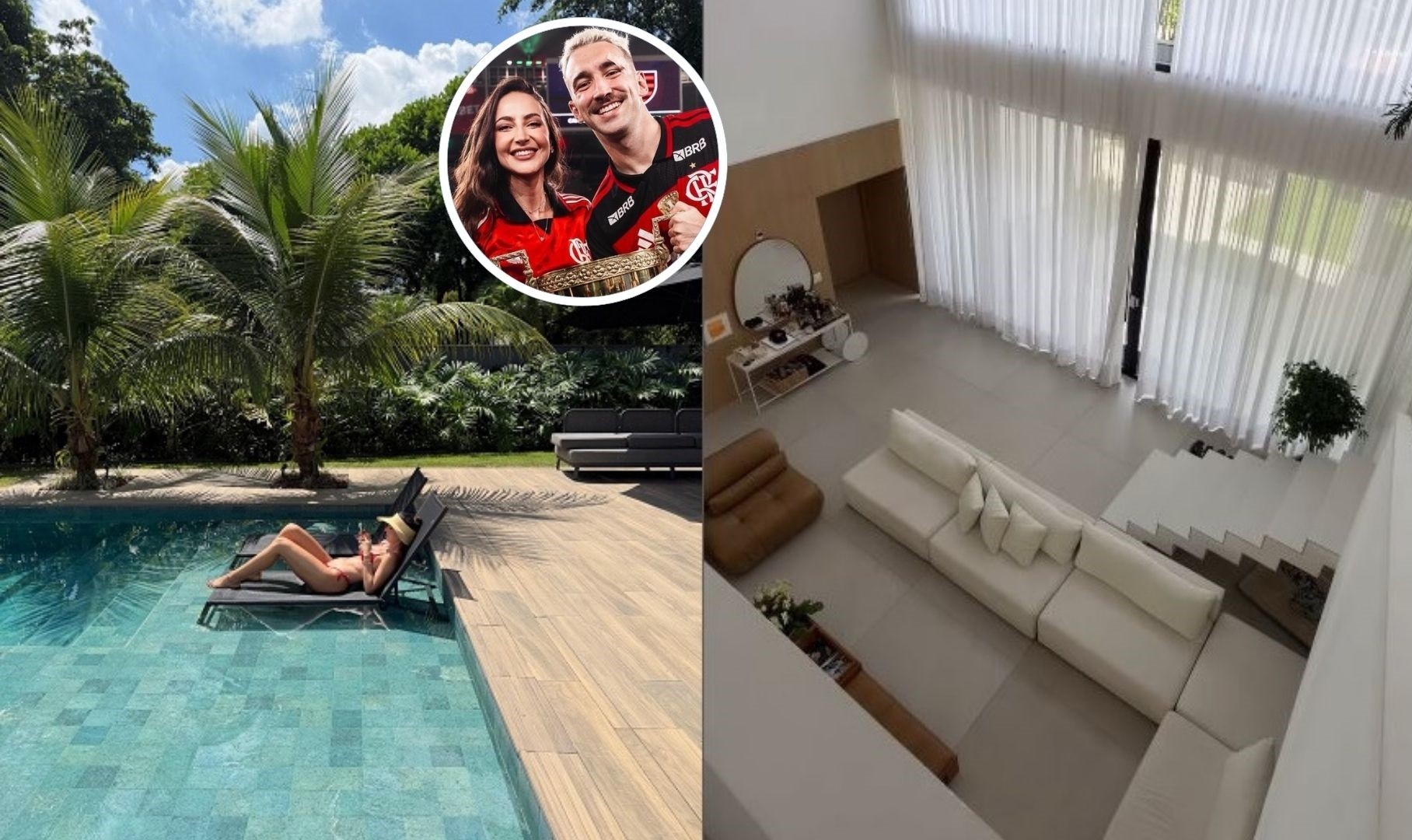 Em fotos postadas pelo casal, é possível ver alguns detalhes do imóvel, como a sala gigante, a bela piscina, cercada de verde, e o espaço gourmet na parte externa da casa. Chama atenção também o closet todo espelhado, com espaço para a grande coleção de tênis do zagueiro rubro-negro e de sapatos de Maitê.