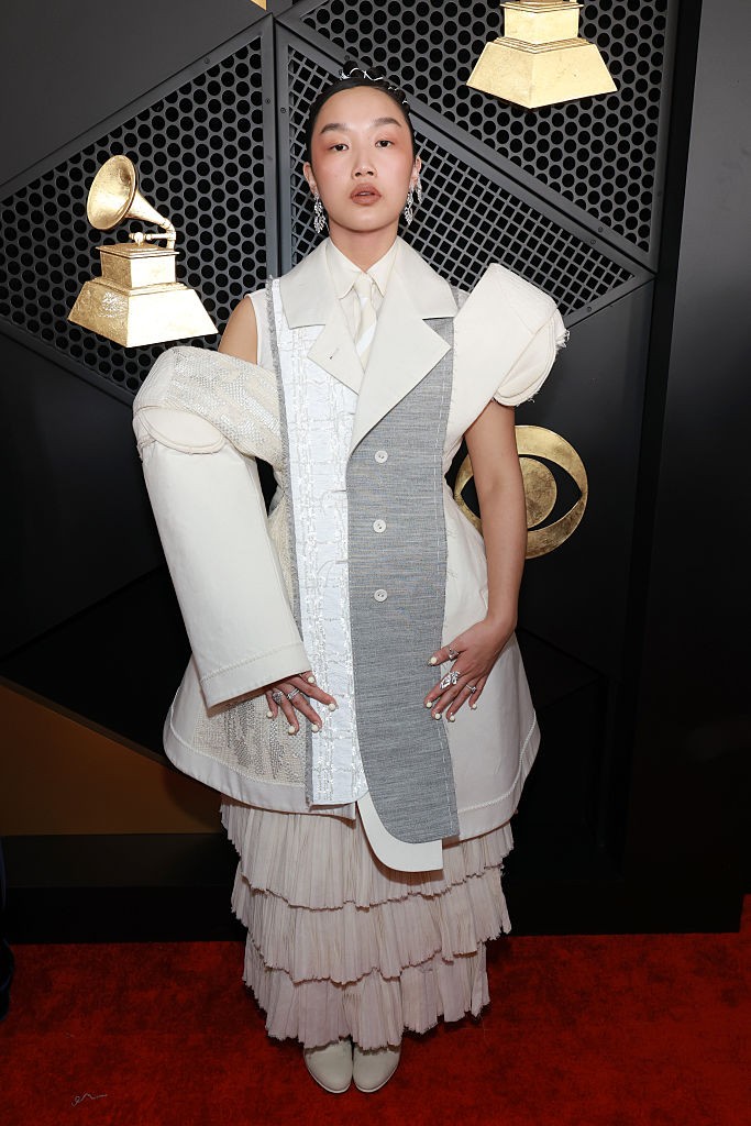 Audrey Nuna, indicada ao Grammy de Melhor Performance Pop Duo/Grupo ao lado das parceiras EJAE e Rei Ami, que integram a banda sul-coreana HUNTR/X, apostou num look inusitado, com efeito de ilusão de ótica.