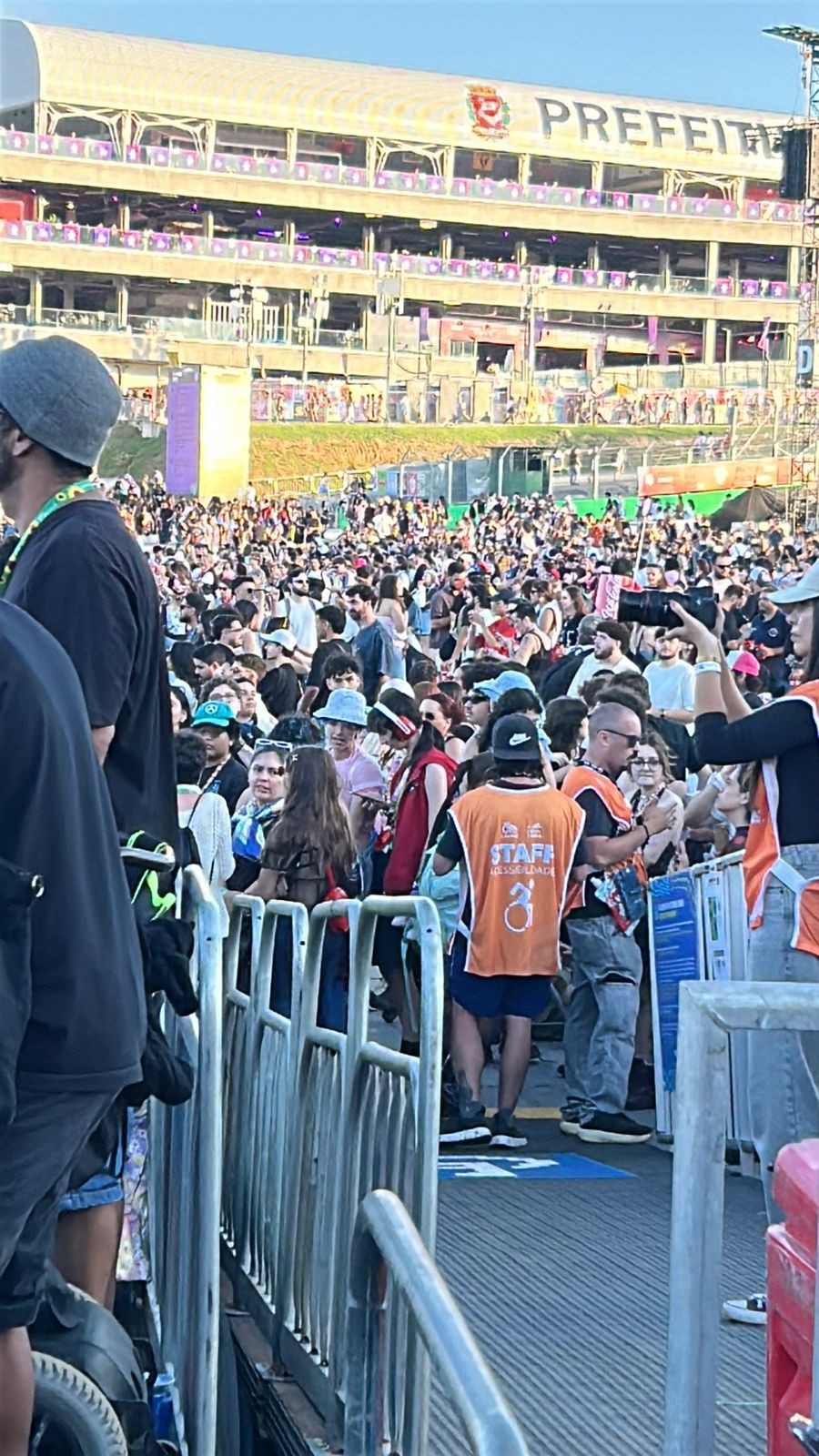 Mariana também relatou problemas de superlotação nas áreas destinadas ao público PCD "Um menino autista, que: estava provavelmente com a mãe dele, teve uma crise, começou a se bater na cabeça e recebeu atendimento depois de pular a grade do local, porque não tinha área de movimentação próxima da plataforma de acessibilidade".
