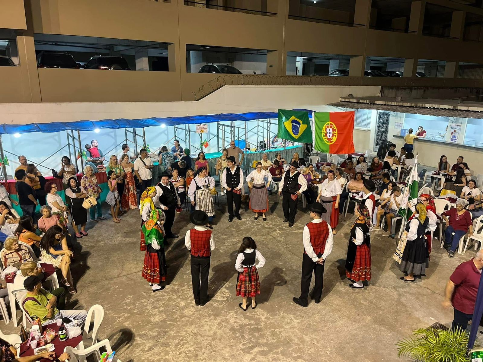 As apresentações de dança portuguesa seguem como um dos momentos mais aguardados. Com coreografias tradicionais, música ao vivo e instrumentos como sanfona e castanholas, os grupos convidados mantêm viva uma prática cultural que nasceu dentro da própria paróquia.