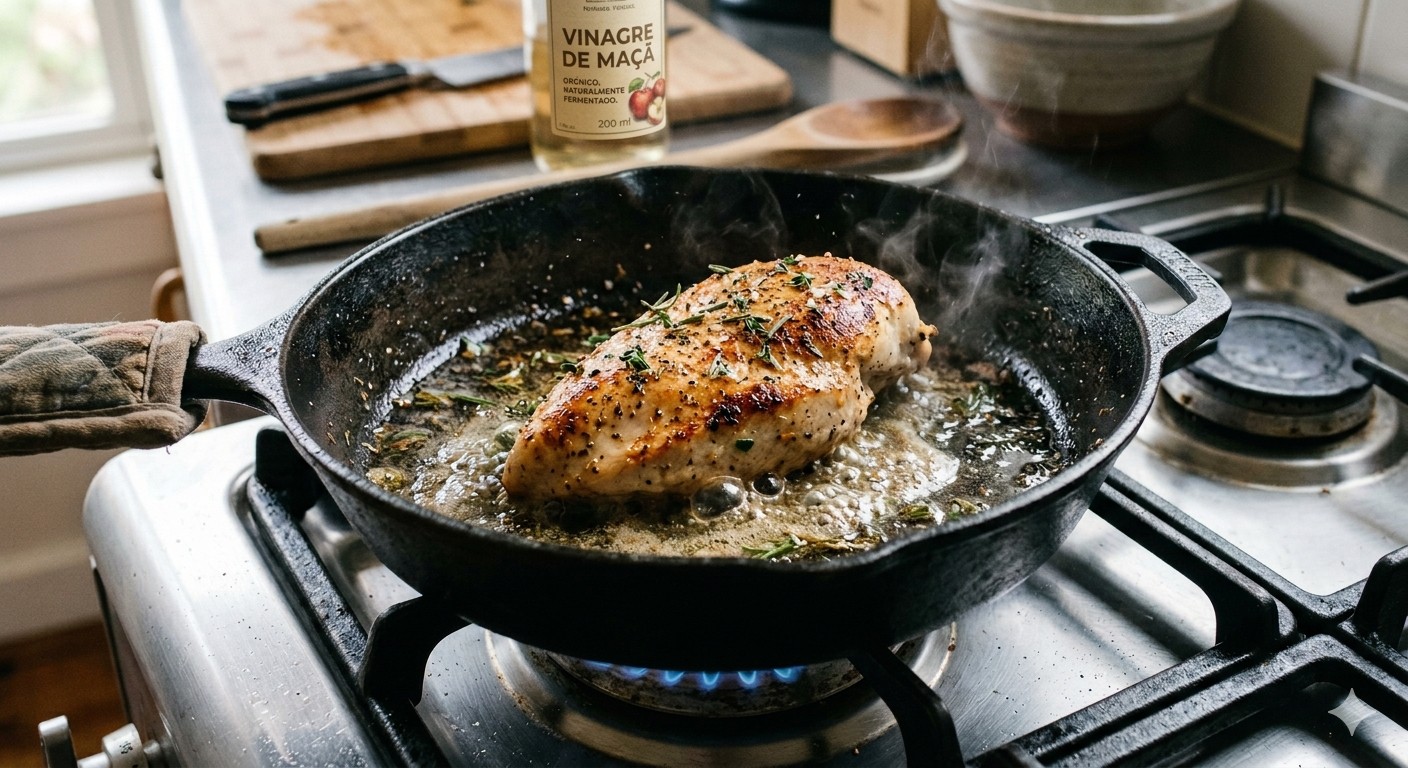 É só adicionar uma colher pequena de vinagre de maçã quando o frango já estiver na frigideira! A substância responsável pela “forcinha” no cozimento é o ácido acético, presente em abundância no vinagre.
