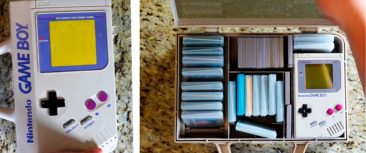 Homem encontrou num brechó um Game Boy de 1989 funcionando, maleta oficial Nintendo e 33 cartuchos dentro. O preço pago? Ele não contou.