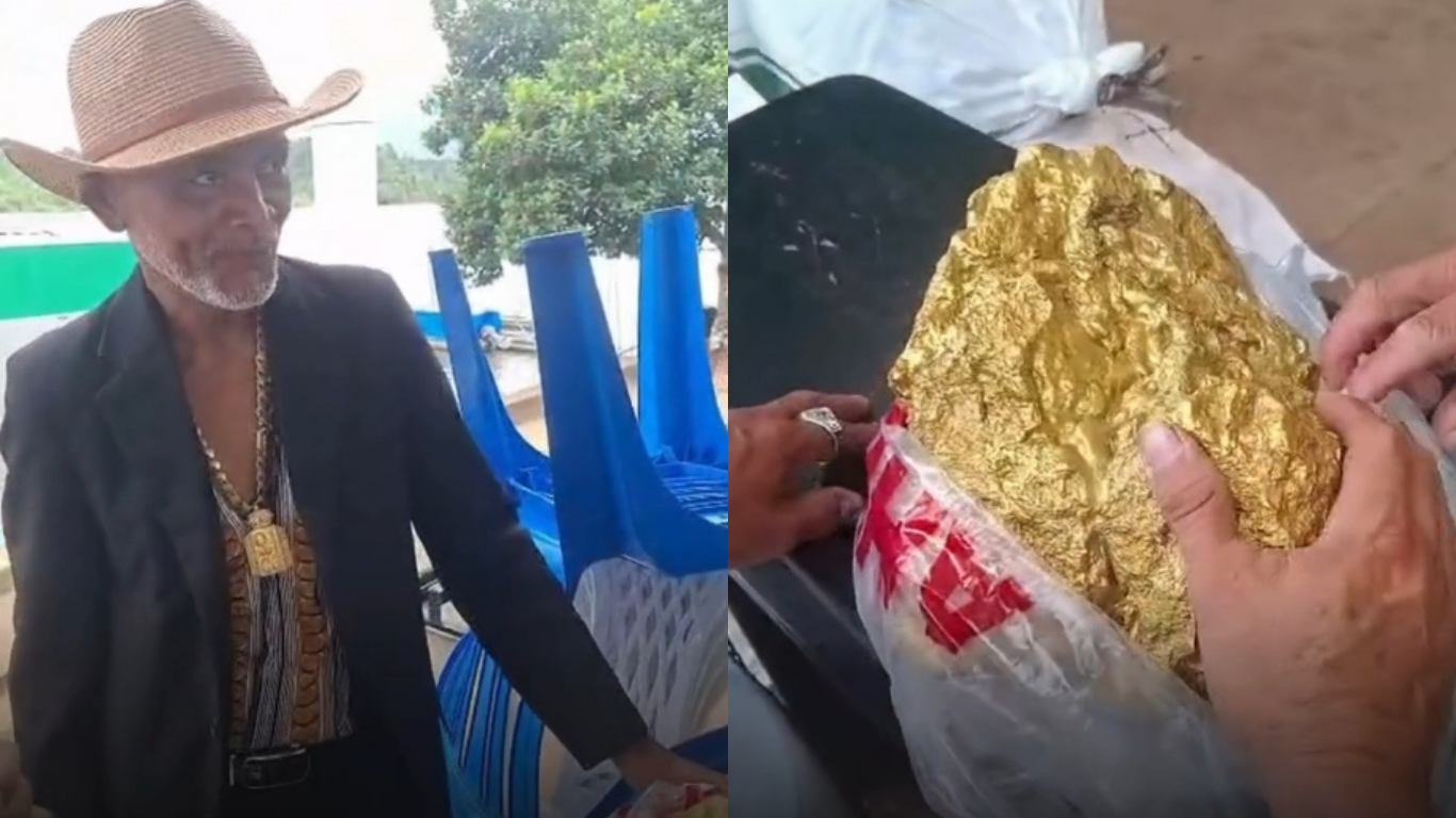 Um vÃdeo viralizou nas redes sociais após mostrar um garimpeiro exibindo uma suposta "pepita de ouro" em um posto de gasolina que fica localizado em Oiapoque, no estado do Amapá. Nas imagens, é possÃvel observar o homem colocando a pedra em cima de uma mesa de madeira, enquanto alguns curiosos se aproximam, com o intuito de saber se a pepita é realmente de ouro ou se é apenas uma brincadeira no local.