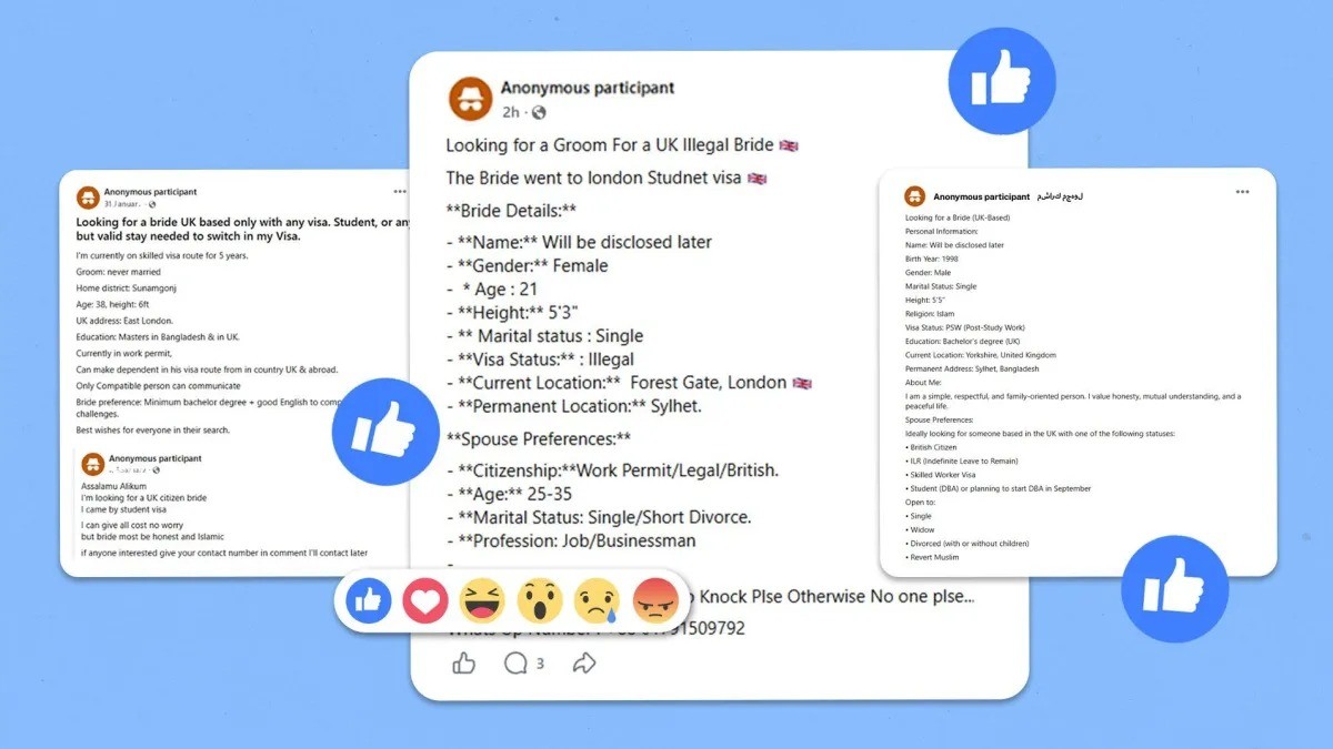 Embora muitos participantes dos grupos compartilhassem preferências pessoais típicas de plataformas de relacionamento, parte dos anúncios deixava claro o interesse em obter статус legal. Em uma das mensagens, um solicitante de asilo afirmava estar “à procura de uma noiva no Reino Unido” e informava seu local de residência. Em outro caso, uma mulher buscava uma cidadã britânica para casar com seu cunhado, que estava no país com visto de cuidador.