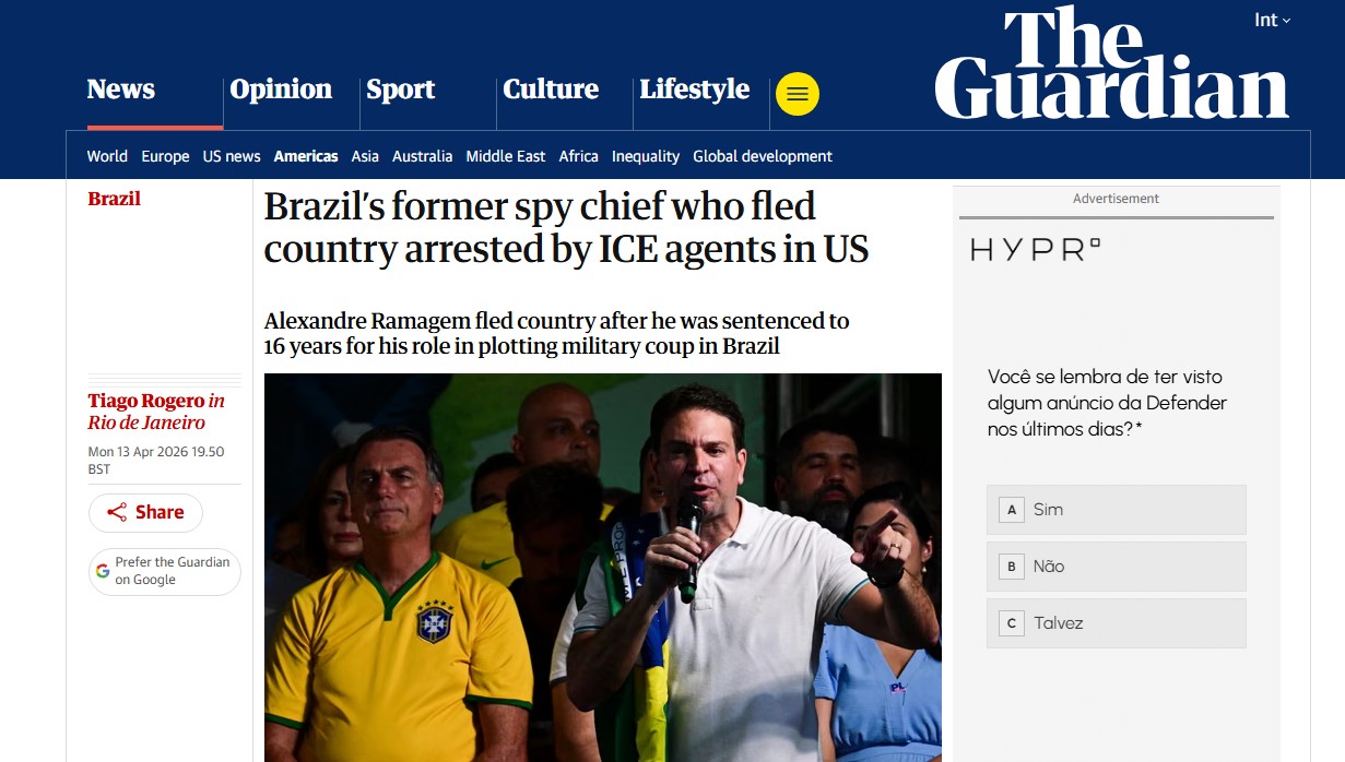 "Quando o ex-presidente do Brasil, Jair Bolsonaro, foi condenado a quase 30 anos de prisão por uma tentativa de golpe, outros seis membros de seu gabinete também foram considerados culpados e começaram a cumprir suas penas – com exceção de um. Dias antes do veredicto, Alexandre Ramagem, ex-chefe da espionagem de Bolsonaro, fugiu de carro para a Guiana e embarcou em um voo para os Estados Unidos, onde permanece desde então", afirma o jornal.