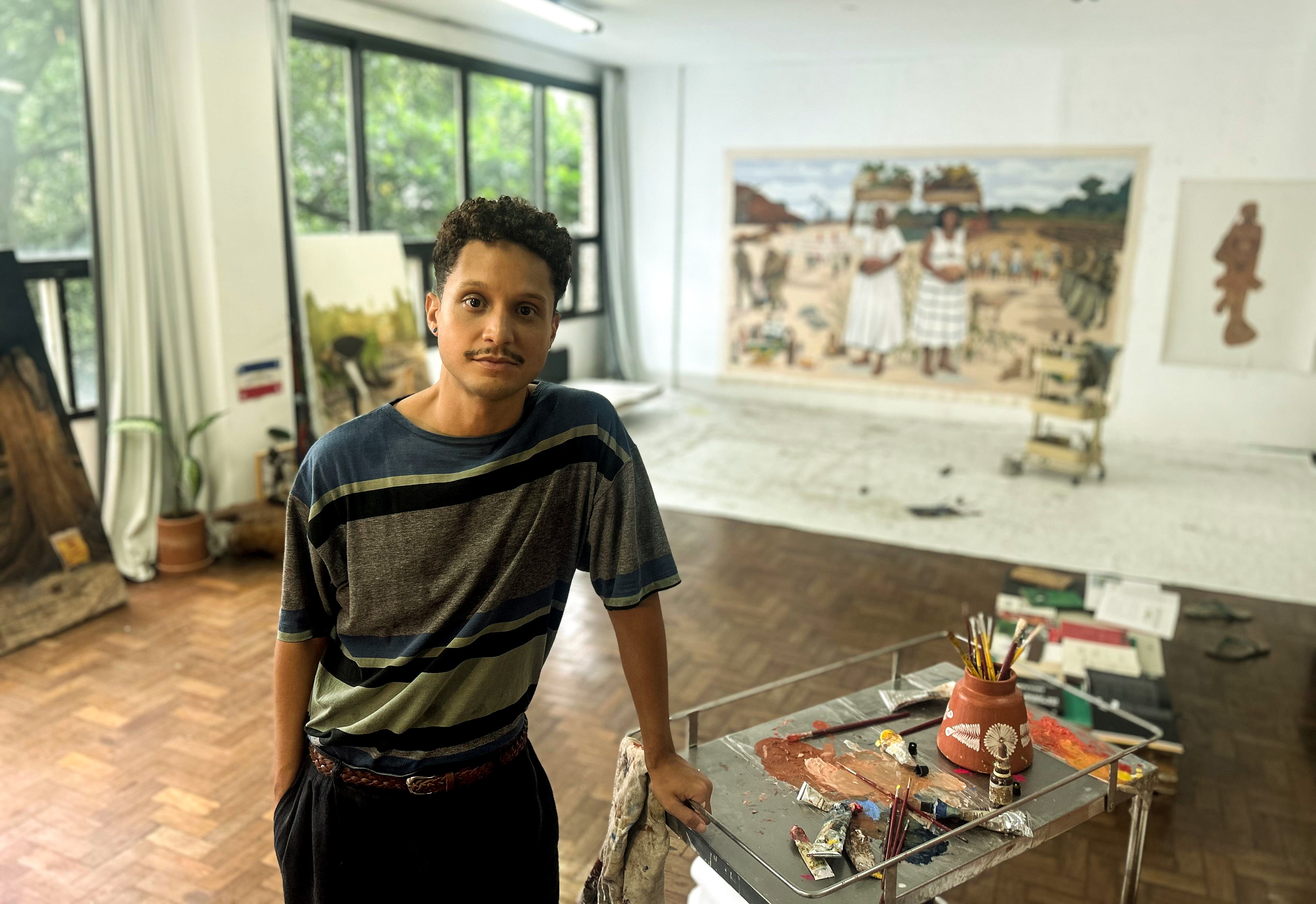 Matheus Ribs, que ganhou notoriedade ao ter um dos trabalhos censurado em exposições— a releitura da bandeira nacional com a inscrição “KilomboAldeya” no lugar de “Ordem e Progresso” —, instalou seu ateliê na Lapa em janeiro do ano passado. O espaço, onde funcionou um estúdio fotográfico, é num imóvel de fundos de um prédio na vizinhança da Sala Cecília Meireles. Da janela, o artista avista, enquanto trabalha, um imenso pé de jenipapo, cuja copa vai até o 5º andar. A árvore, que faz companhia a uma mangueira, cresceu num terreno vazio ao lado, proporcionado um clima bucólico em meio ao burburinho da Lapa.