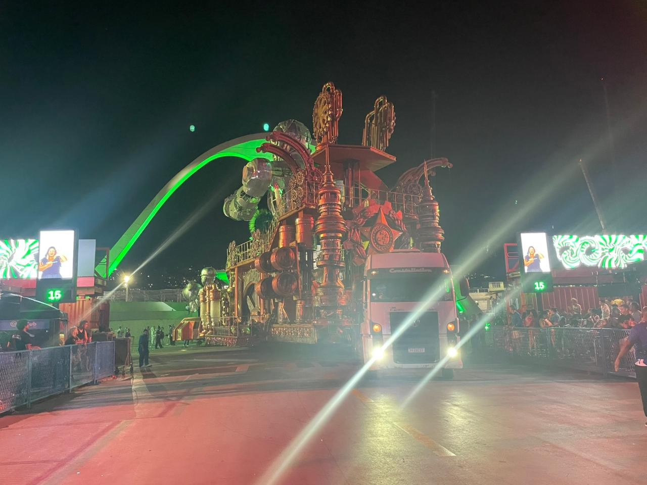 Mais de 15 minutos após fim do desfile, carro alegórico da Acadêmicos de Niterói continua empacado na dispersão