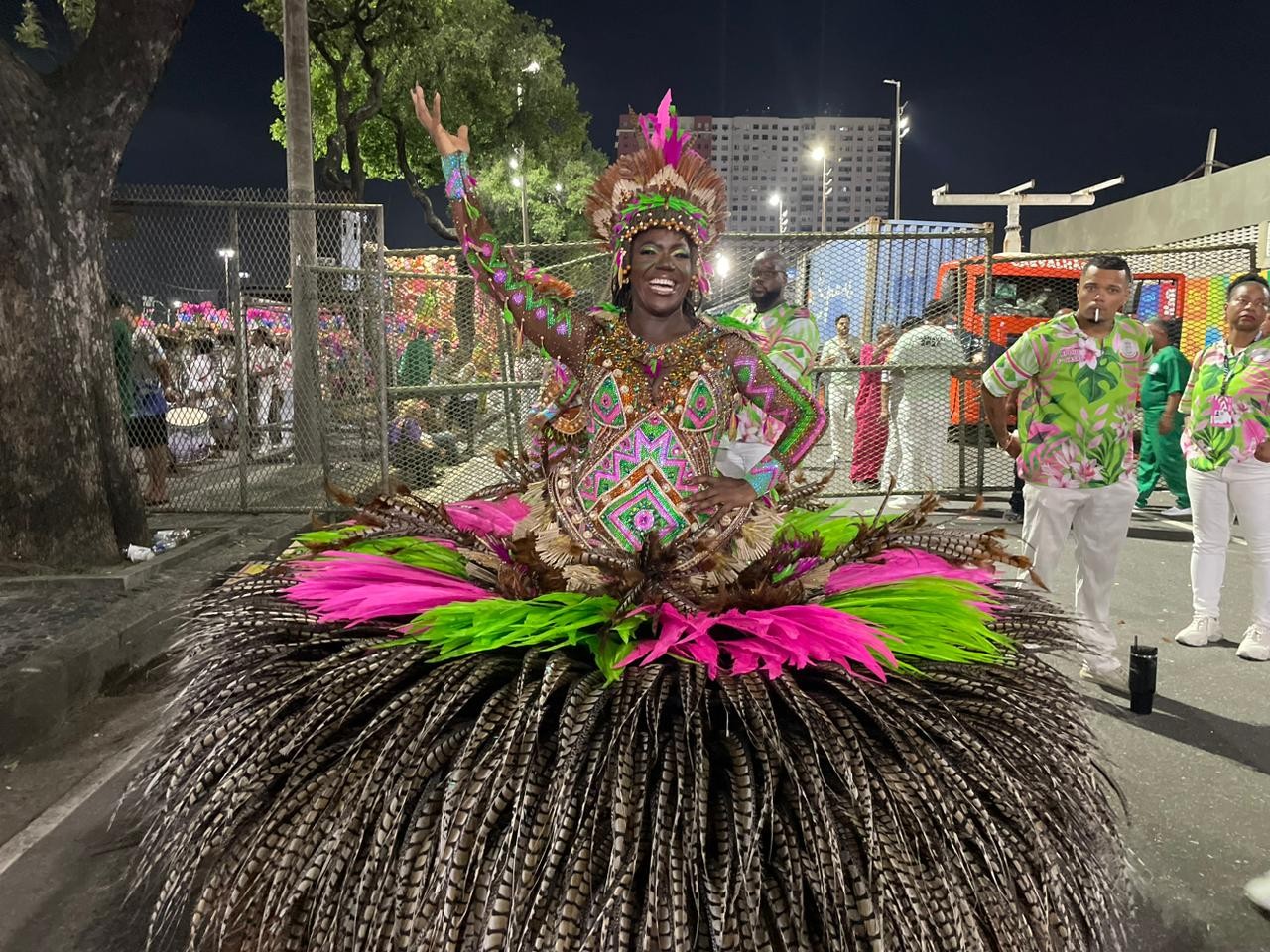 Além da coreografia tripla, outro detalhe técnico chama atenção: o calçado da porta-bandeira. Cintya aderiu à tendência das botinhas — modelo que vem substituindo o tradicional salto fino.