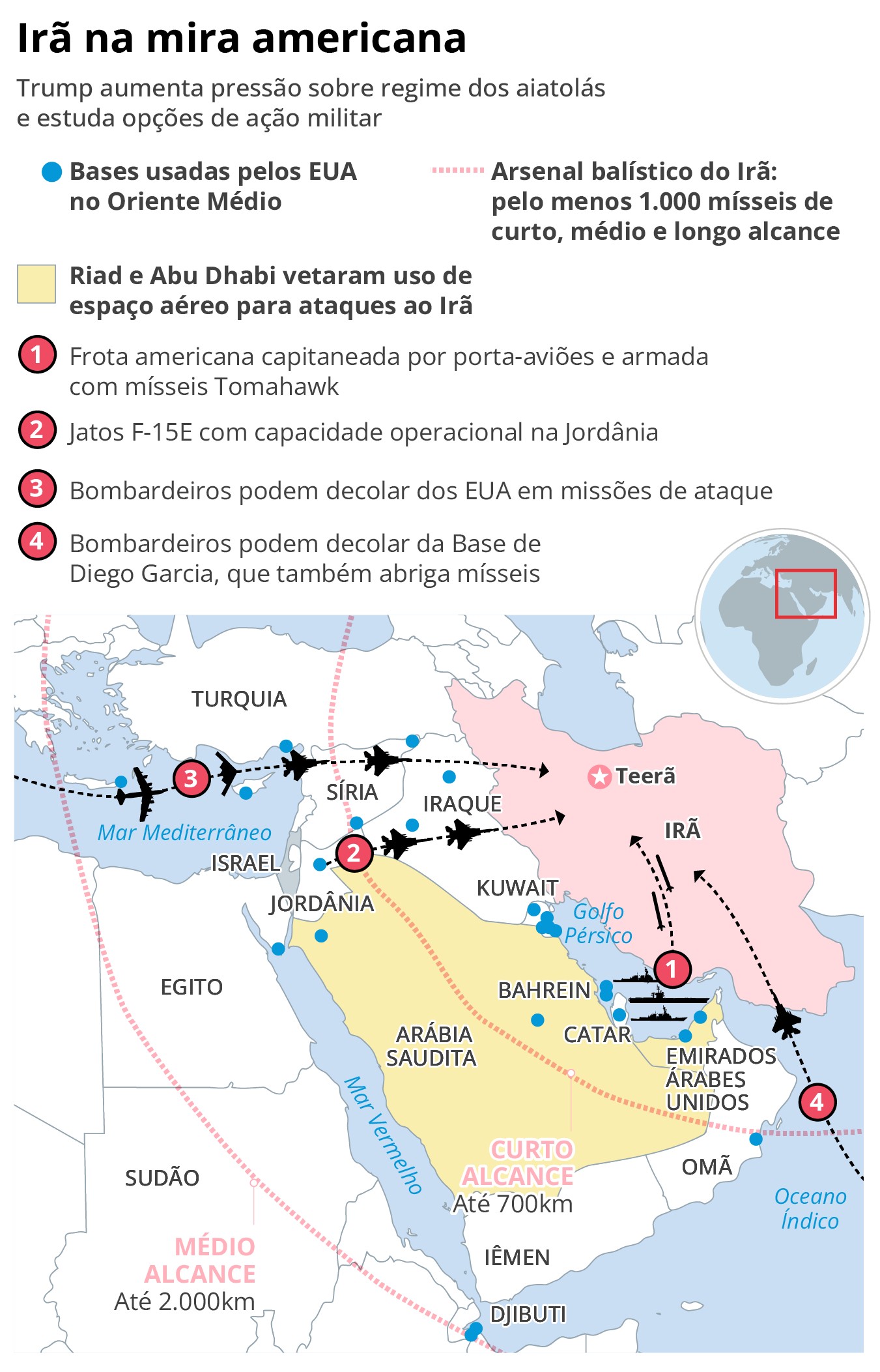 Mapa mostra opções de ataque dos EUA ao Irã sem Arábia Saudita e Emirados Árabes Unidos; veja