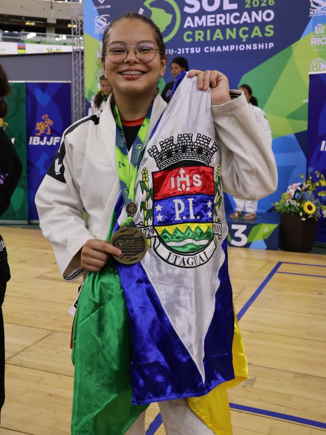 A jovem atleta Maria Clara “Pitbull”, de 13 anos, conquistou a medalha de bronze no Campeonato Sul-Americano Kids de Jiu-Jitsu da IBJJF, realizado no último dia 8, no Parque Olímpico da Barra da Tijuca, no Rio de Janeiro. Faixa laranja, ela competiu na categoria Juvenil 2 e representou o município de Itaguaí em uma chave concorrida que reuniu outras sete atletas.