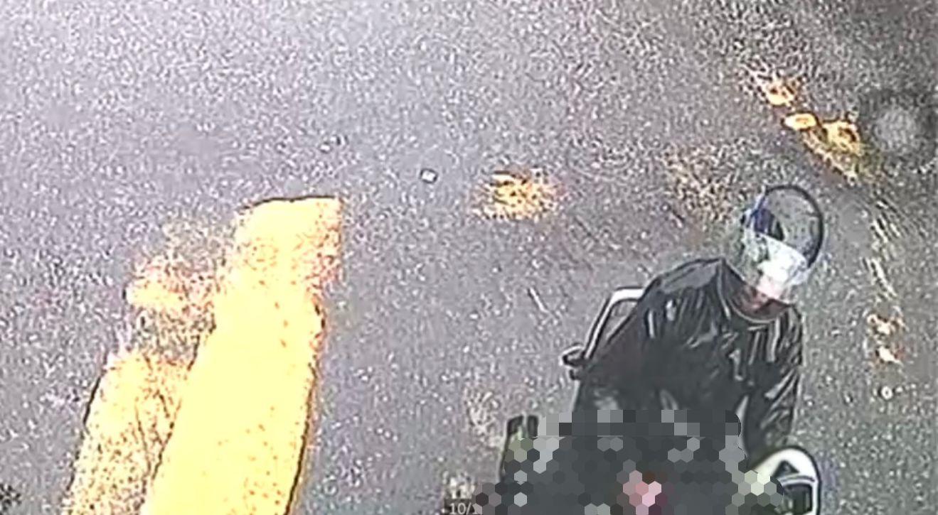 Nas imagens, o homem aparece parado em uma moto usando capa de chuva e capacete, já que chovia no momento da gravação. Pouco depois, uma mulher passa pelo local carregando algumas sacolas de compras e utilizando uma sombrinha para se proteger da chuva, aparentemente retornando de um mercadinho da área.