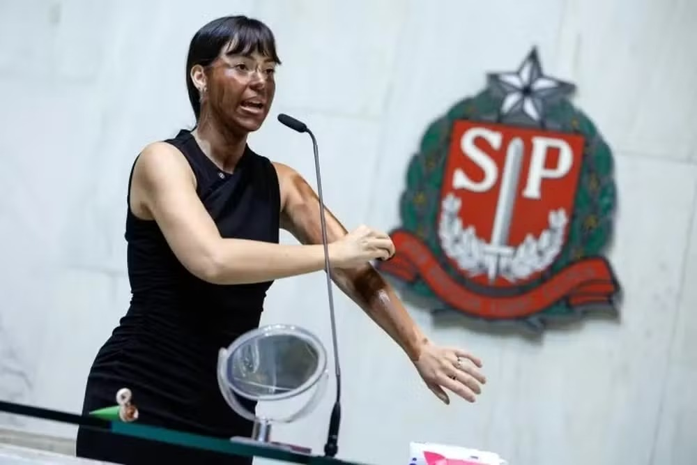 Durante discurso em plenário, a parlamentar utilizou maquiagem em uma encenação classificada como “blackface”, o que gerou reação imediata entre deputados e críticas nas redes sociais.