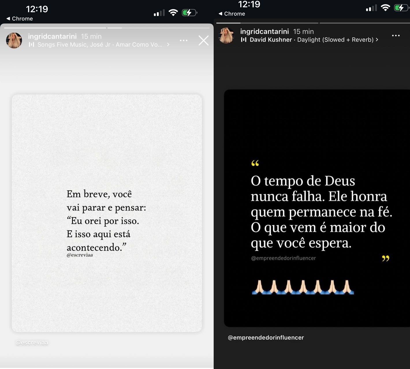 "Em breve você vai parar e pensar: 'Eu orei por isso. E isso está acontecendo", postou Ingrid Cantarini, acrescentando depois mais uma reflexão: "O tempo de Deus nunca falha. Ele honra quem permanece na fé. O que vem é maior do que você espera".
