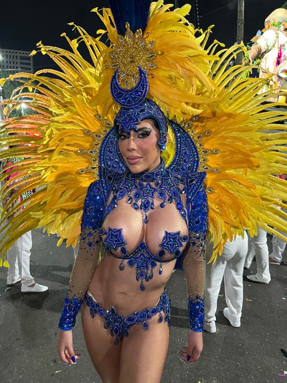 Para o desfile, ela usa uma fantasia de mais de 7 mil cristais, aplicados manualmente; além de 2 mil rabos de galo e 150 penas de faisão.