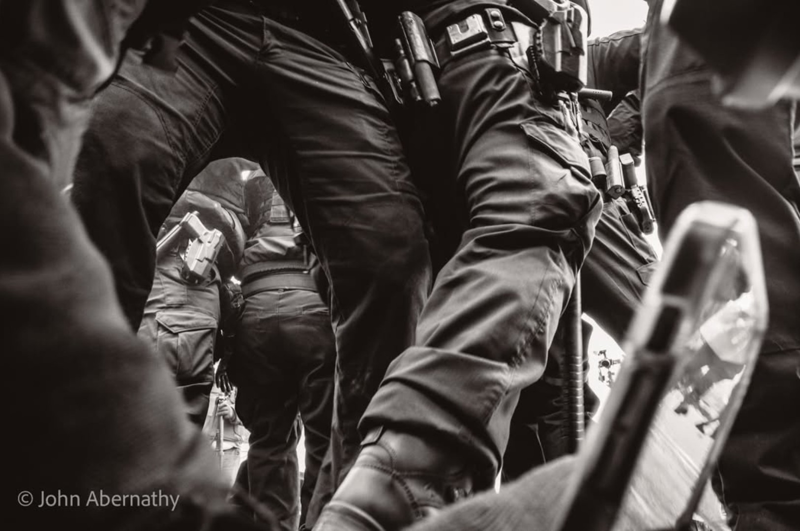 Foi nesse momento de confusão que Abernathy foi atacado por agentes. “Eu fui derrubado e caí de cara no chão. Ajoelharam nas minhas costas e gritaram comigo.” Mesmo caído e cercado, conseguiu capturar uma imagem marcante. “Vi que estava rodeado por um monte de botas pretas e pensei que deveria fazer uma foto. Eu tinha deixado o foco da minha câmera configurado em uma distância específica. Também nem pensei na composição da imagem. Só cliquei.”, contou.