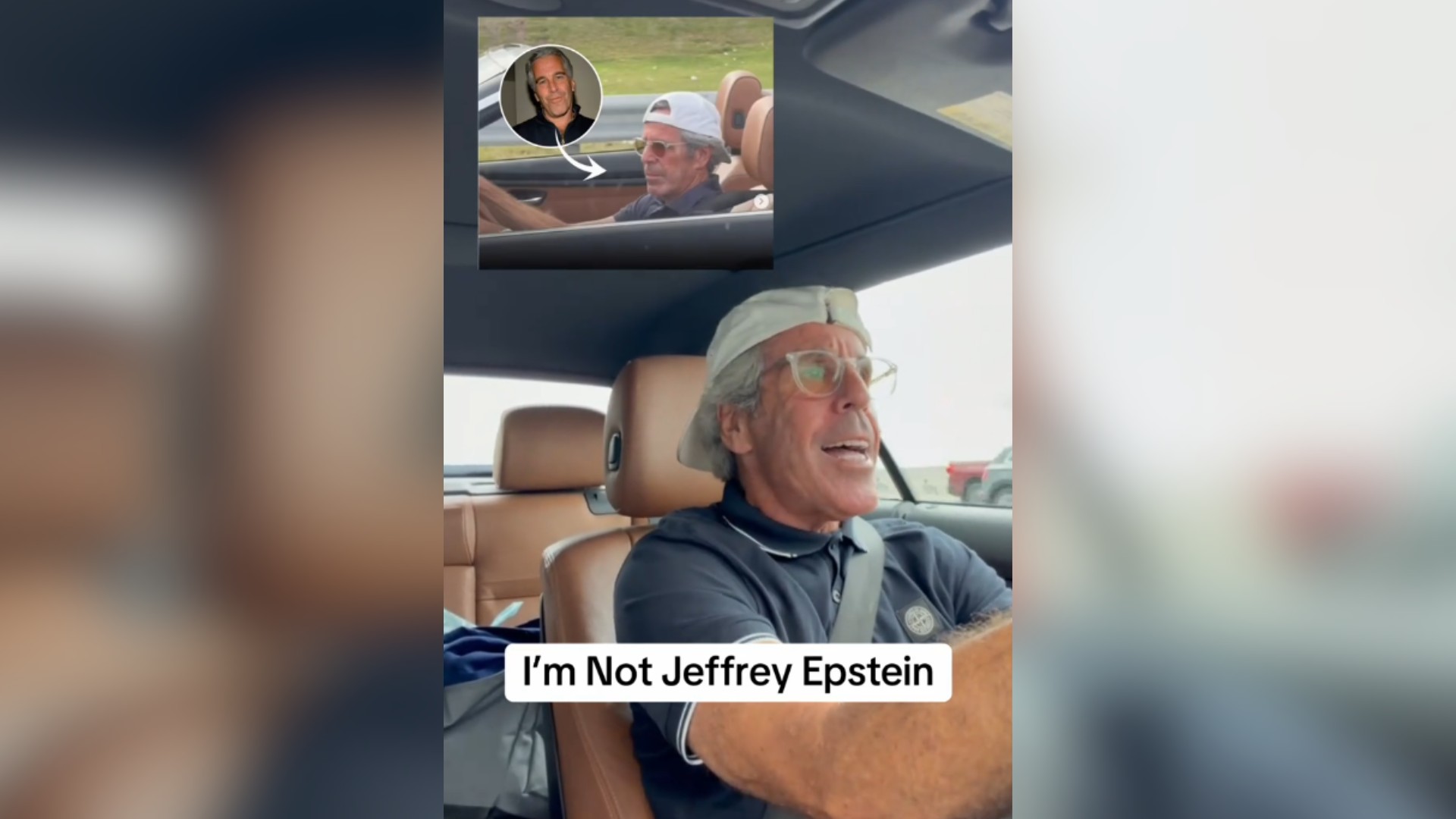 Uma pessoa de dentro do carro pergunta pra ele: "Então você não é Jeffrey Epstein?". O homem confirma.