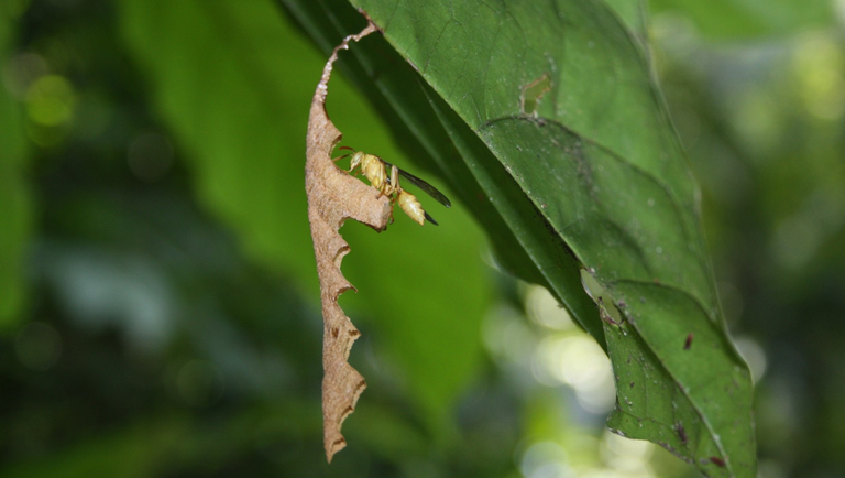 “Suspeitei que fosse a espécie, mas não a coletei de imediato. Fiz a foto e mostrei para o professor. Ele disse: ‘essa espécie é a Mischocyttarus artifex. Onde está?’ Voltei para coletar o material e ele estava com uma pupa, ou seja, um indivíduo que ainda não tinha nascido”, detalha o estudante que, além do ninho e da pupa, capturou também uma vespa fêmea.
