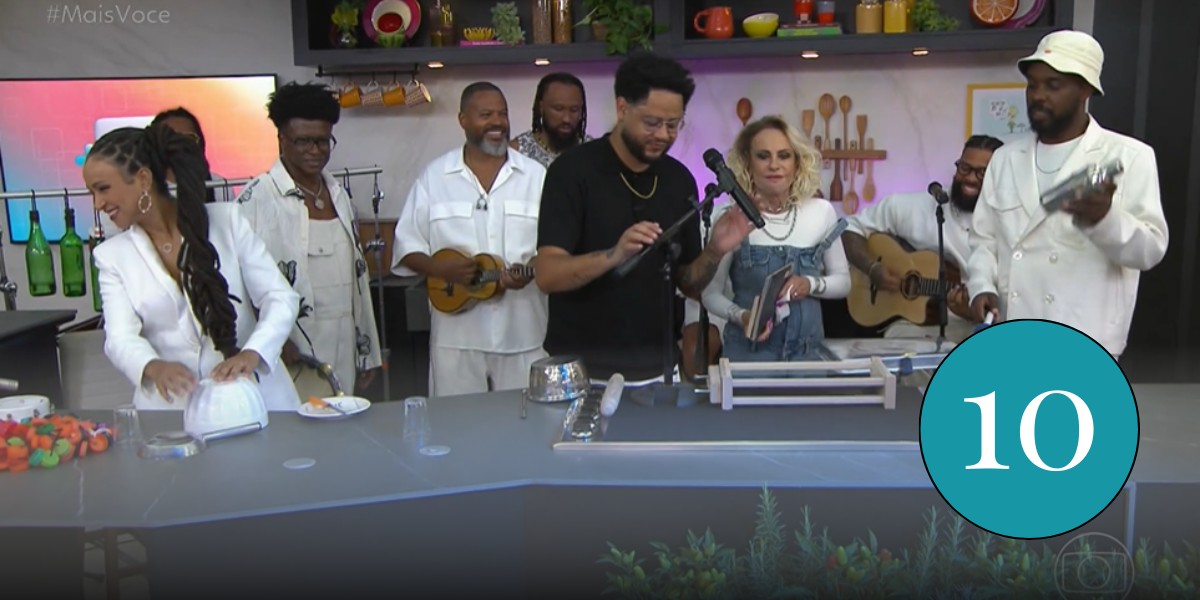 Para a participação de Emicida na edição de ontem do “Mais você”. O programa reuniu música de qualidade e papo delicioso. O cantor sempre tem muito a dizer. E o final foi comovente, com Ana Maria Braga relembrando Tom Veiga, o Louro José.